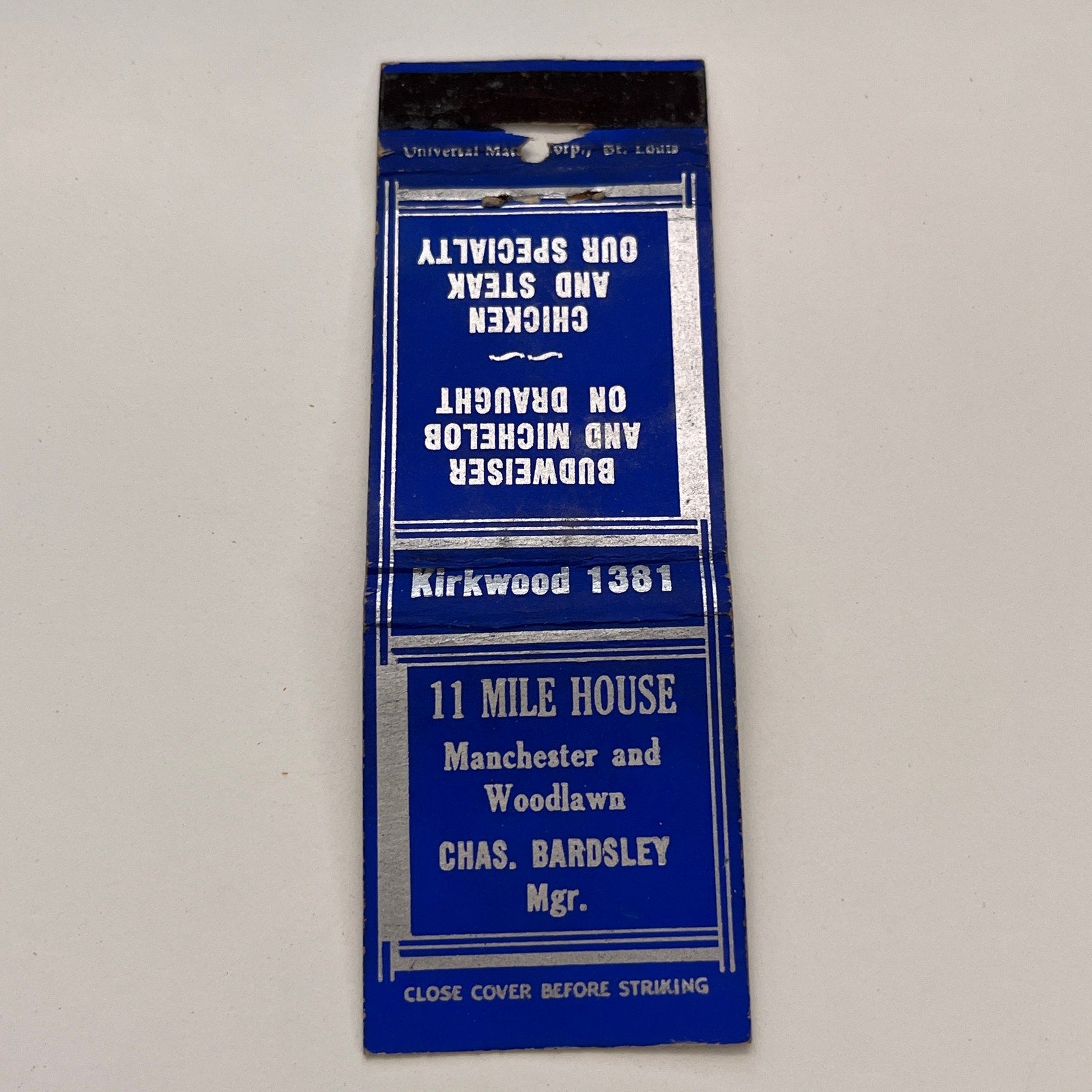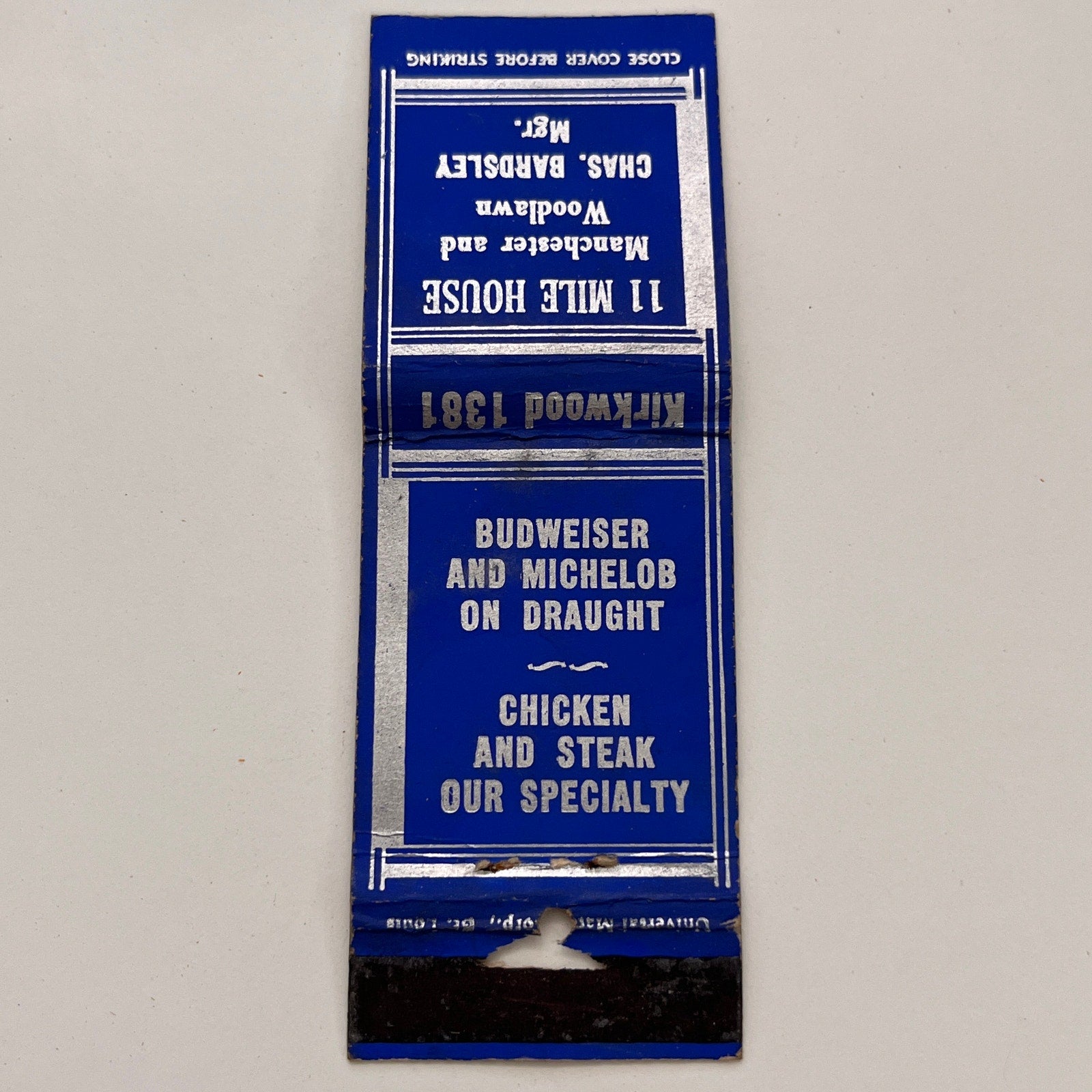 11 Mile House Manchester & Woodlawn Chas Bardsley Vintage Matchbook TB6-MB2-15