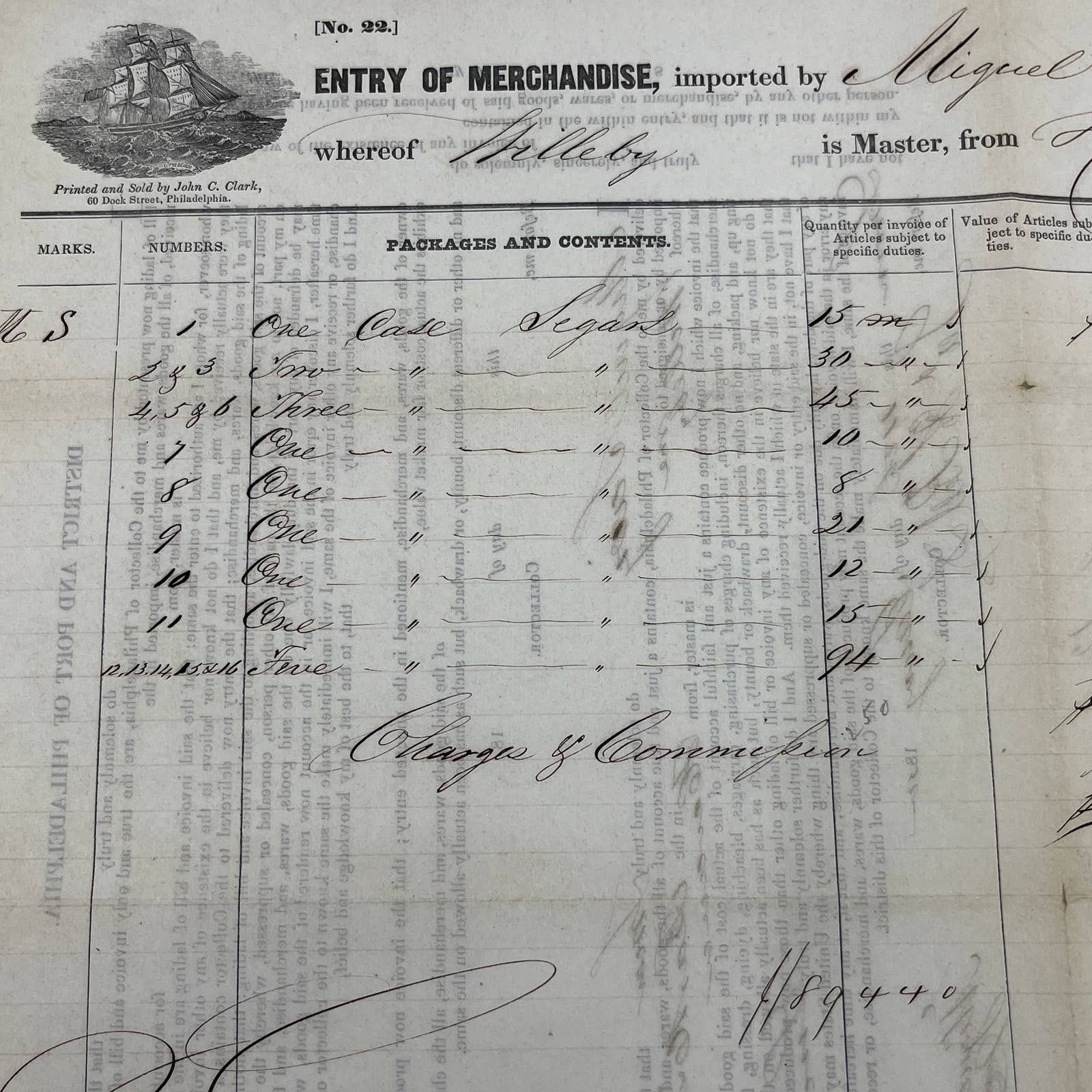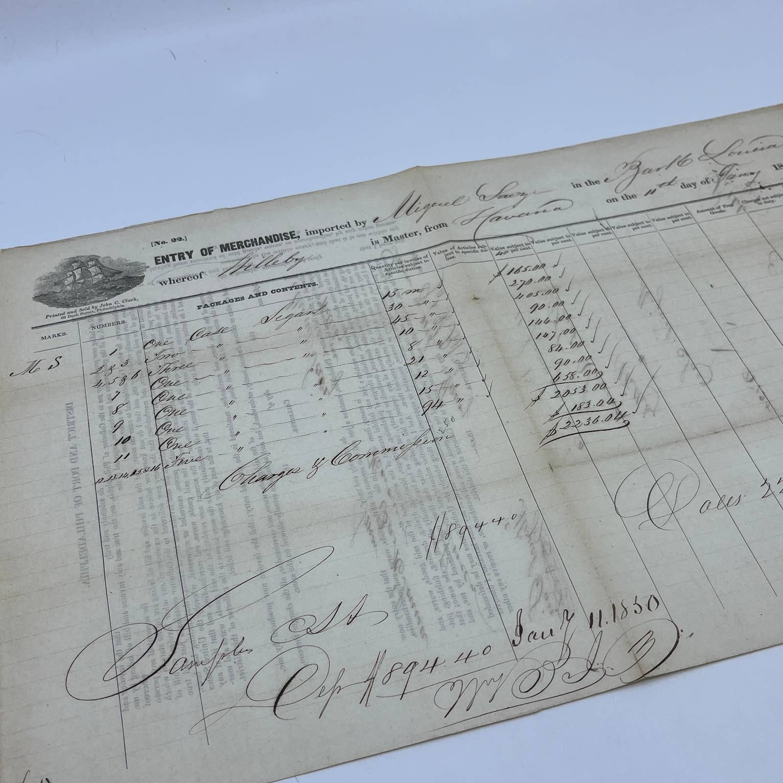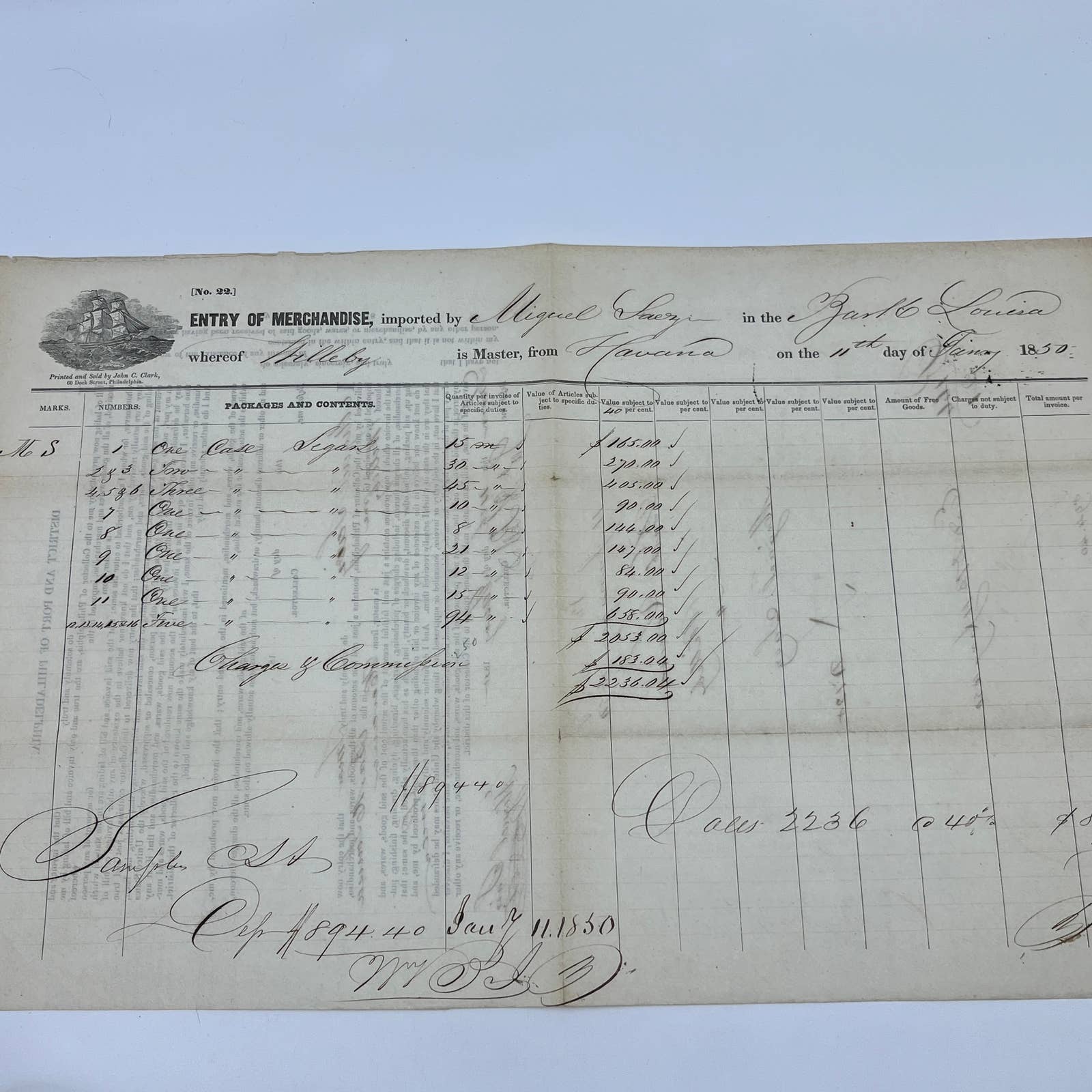 1850 Cargo Ship Port of Philadelphia Bill of Lading from Havana Cuba for Cigars AC2