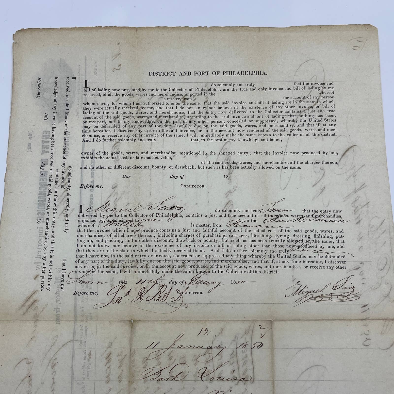 1850 Port of Philadelphia Bill of Lading from Havana Cuba for Cigars AC2