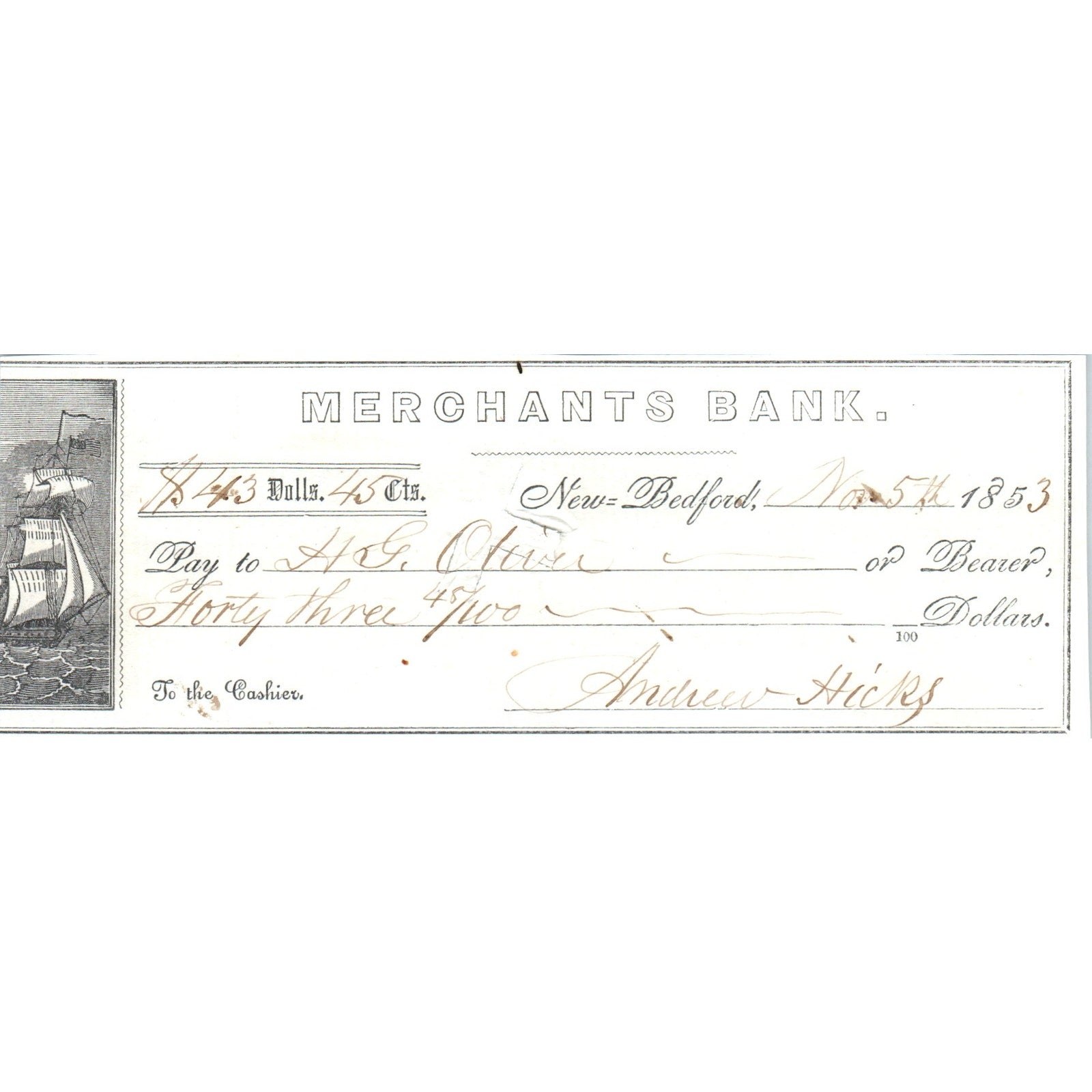 1853 Andrew Hicks Merchants Bank of New Bedford Check AF2-A3
