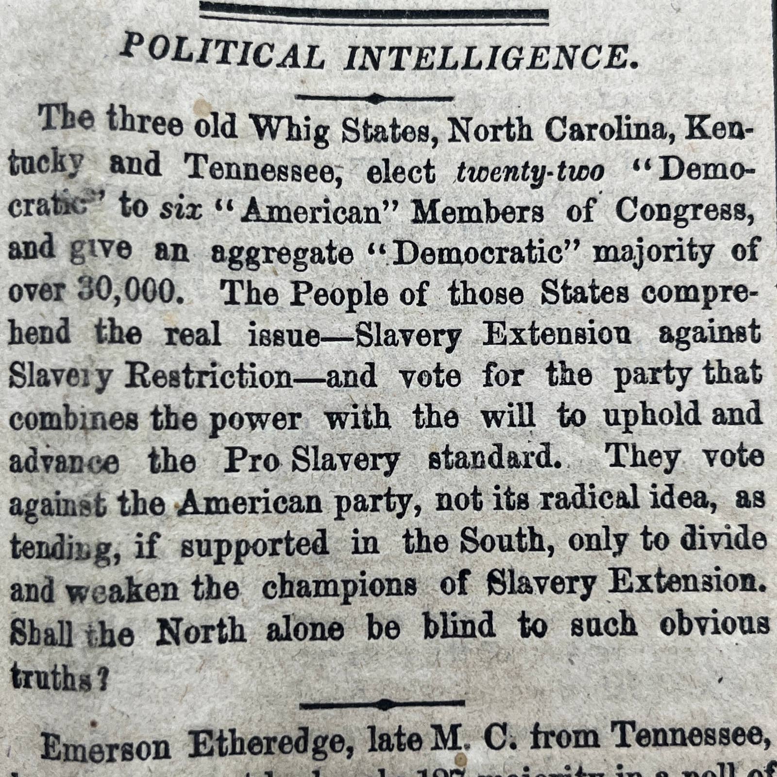 The three old Whig States, North Carolina, Ken-tacky and Tennessee, elect twenty-two Demo-cratic" to six " American? Members of Congress, and give an aggregate " Democratic" majority of over 30,000. The People of those States comprehend the real issue-Slavery Extension against Slavery Restriction and vote for the party that combines the power with the will to uphold and advance the Pro Slavery standard.