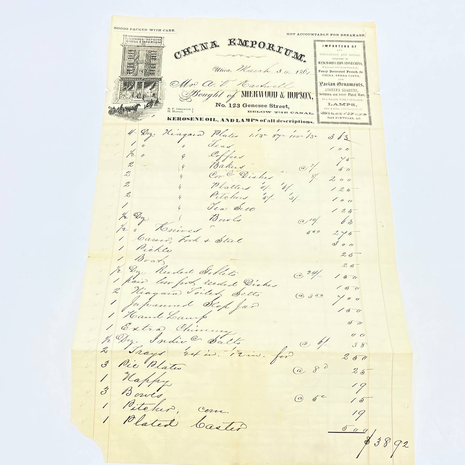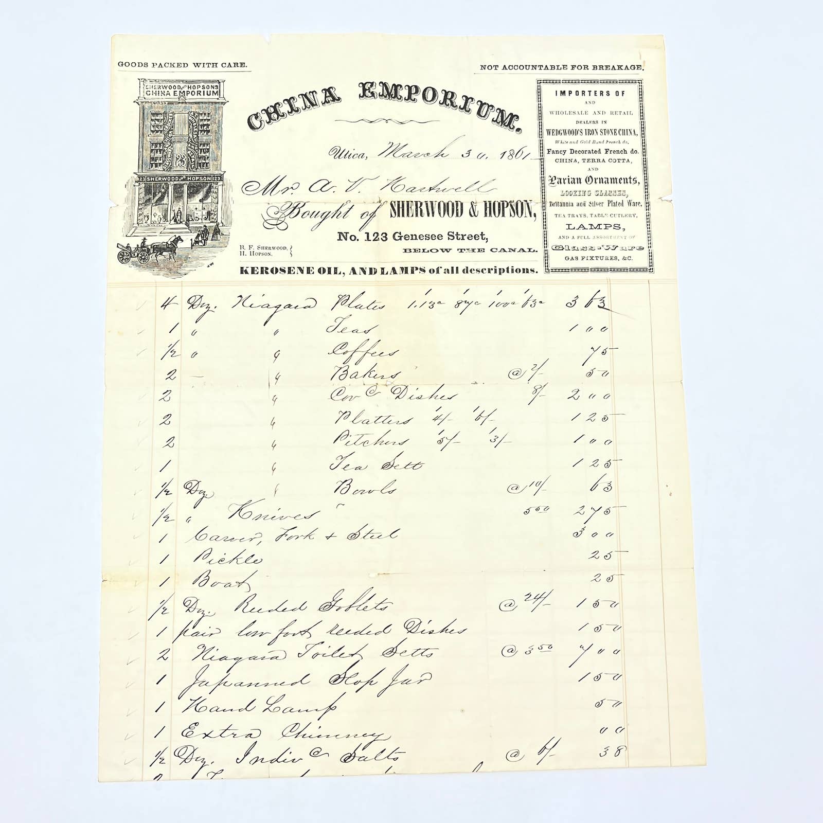 1862 Civil War Era Letterhead China Emporium Kerosene & Lamps Utica New York AC2