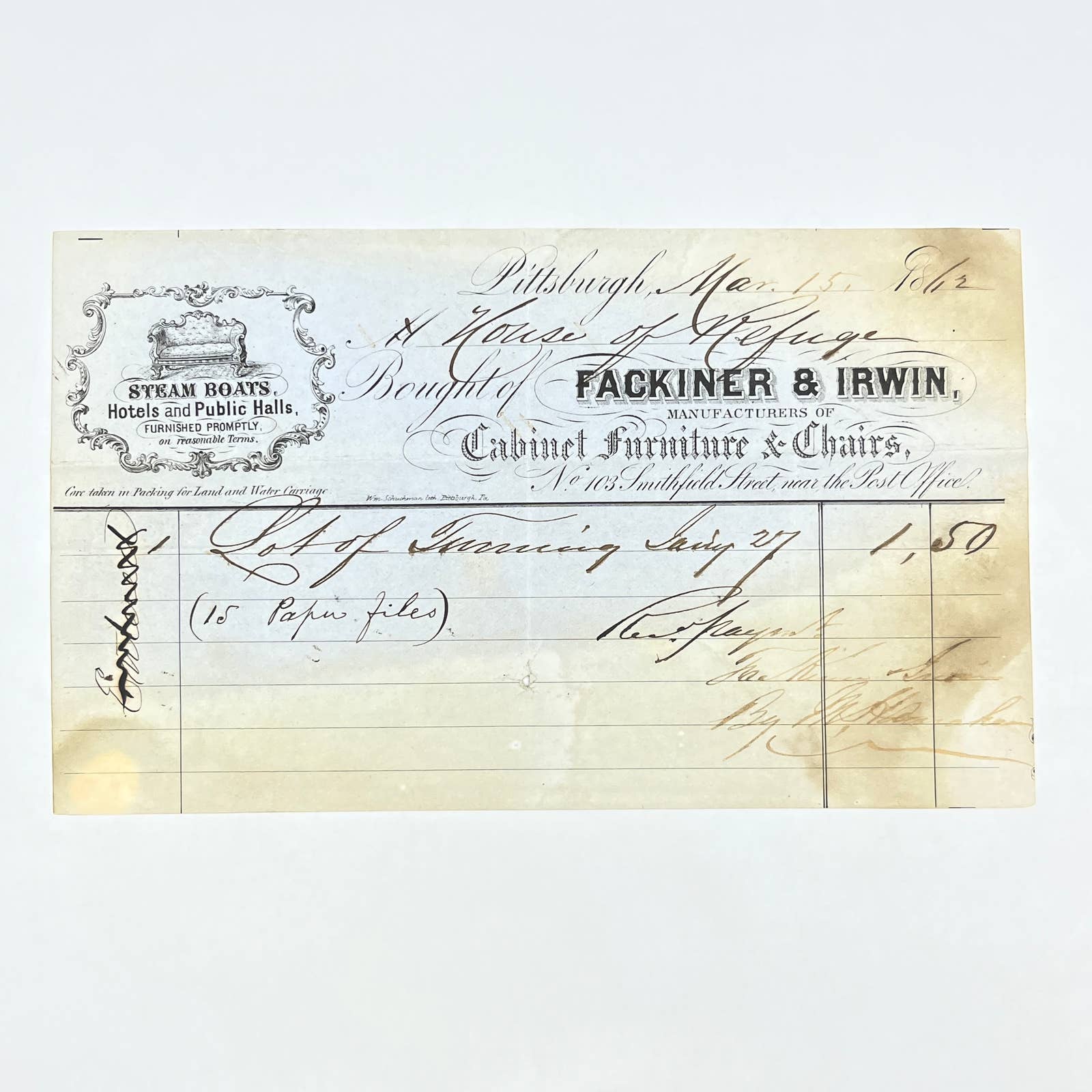 1862 Civil War Era Letterhead Fackiner & Irwin Cabinet Furniture & Chairs Pittsburgh to House of Refuge AC2
