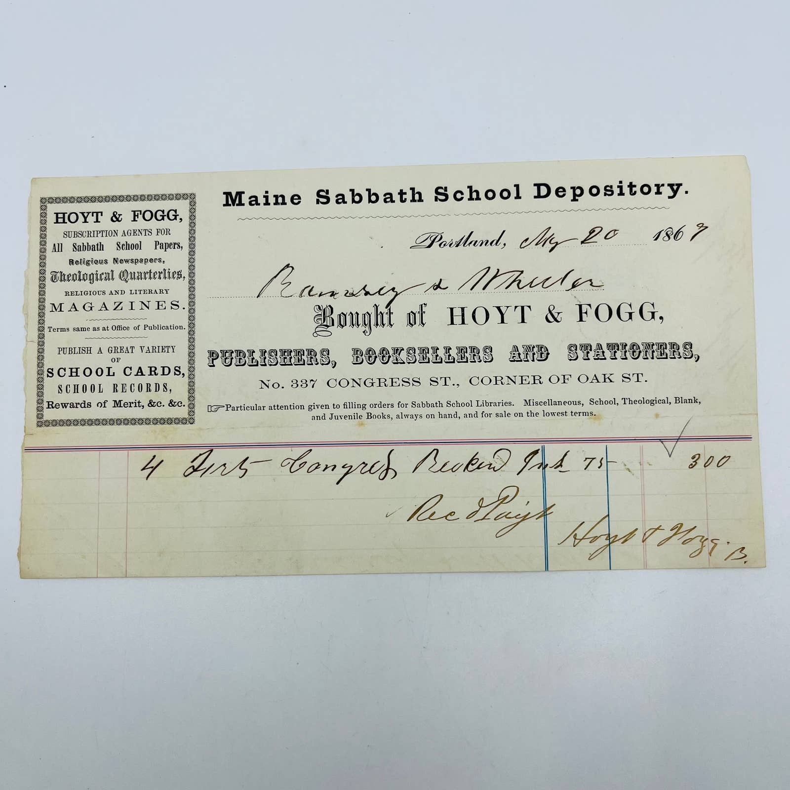 1867 Hoyt & Fogg Falmouth Hotel Stamp Portland ME Billhead Letterhead AA4