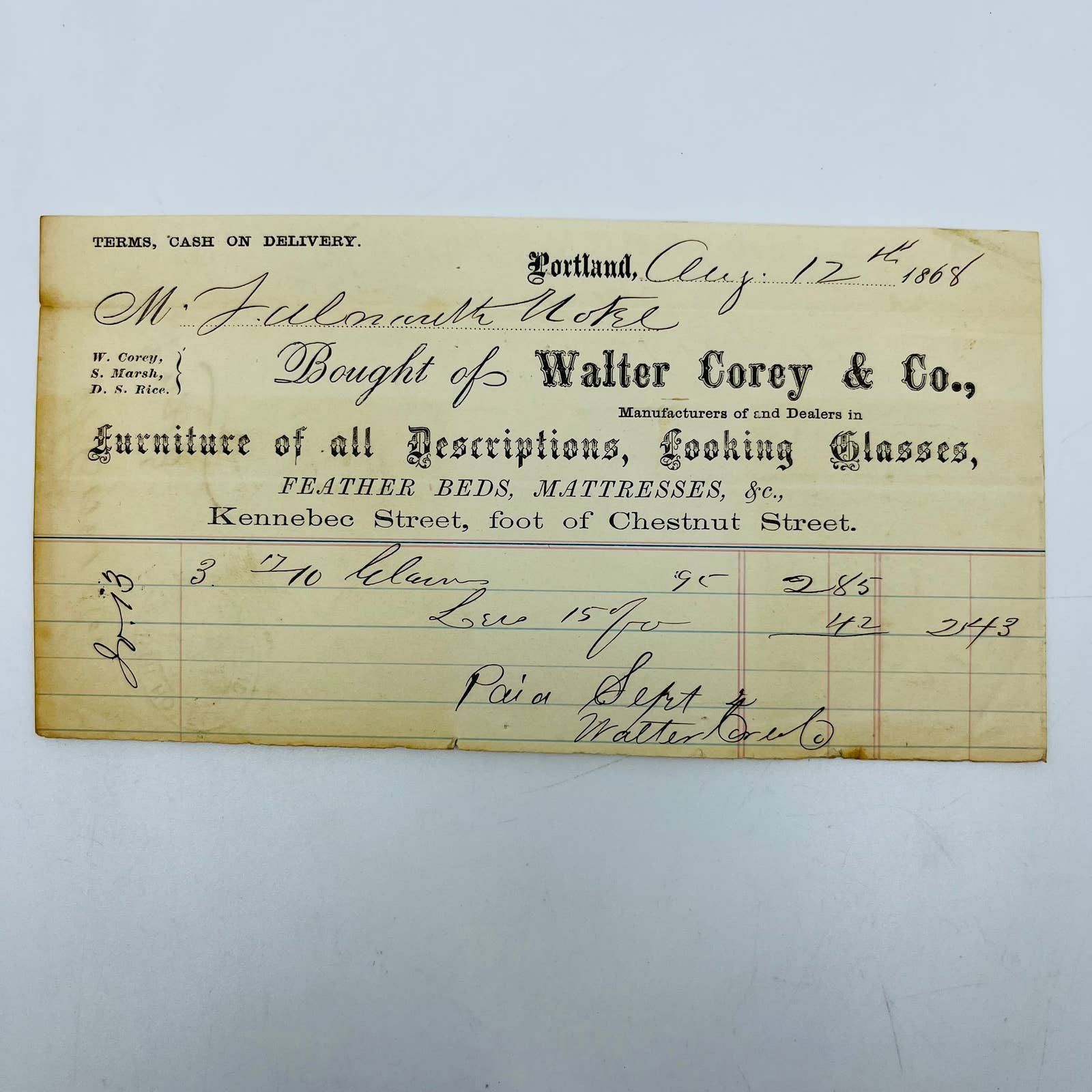 1868 Walter Corey & Co. Furniture Portland ME Falmouth Hotel Stamp Billhead AA5