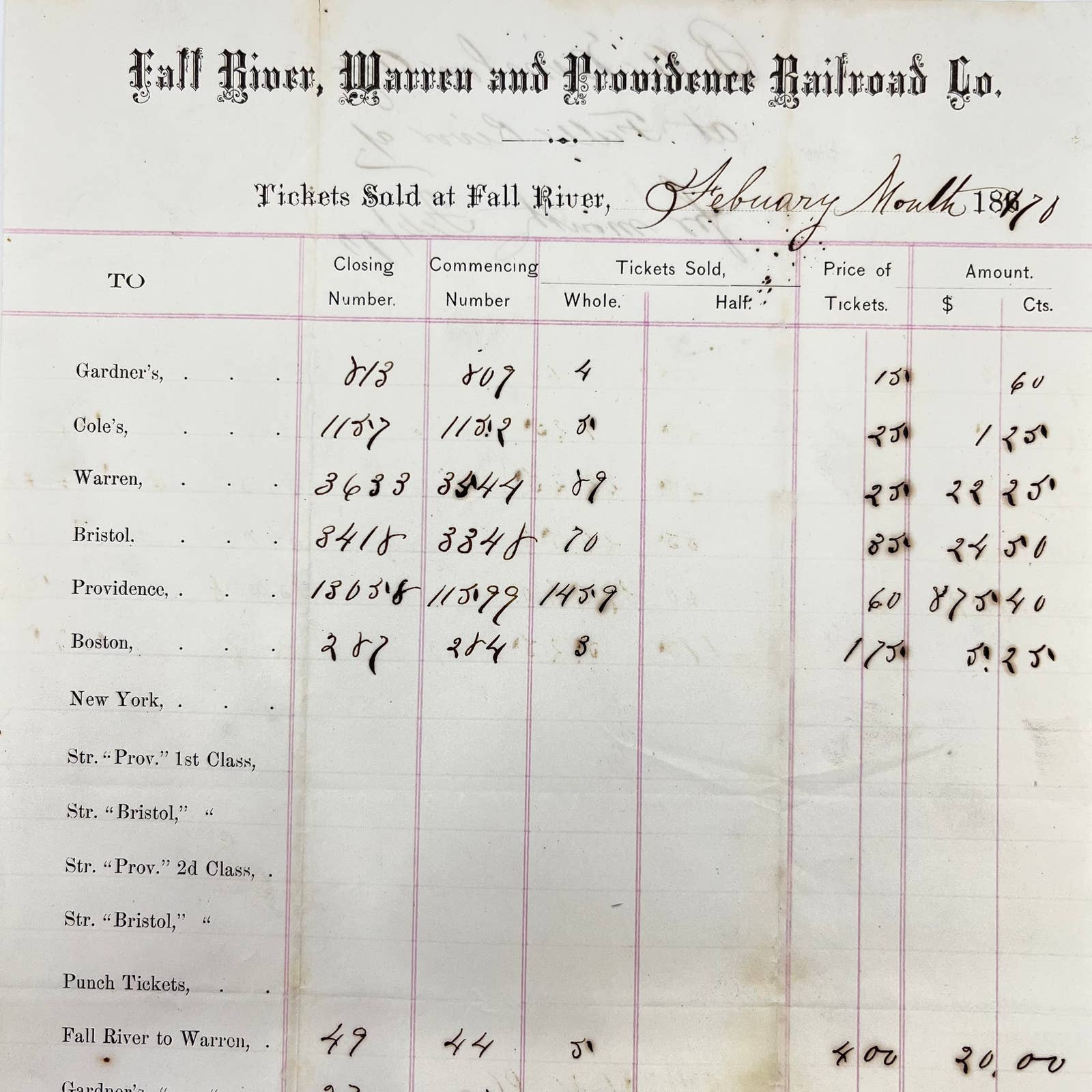 1870 Fall River, Warren and Providence Railroad Co. Invoice Billhead AB1