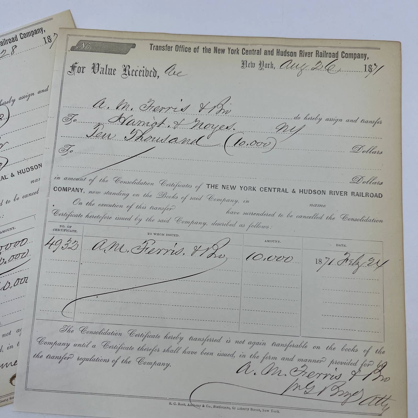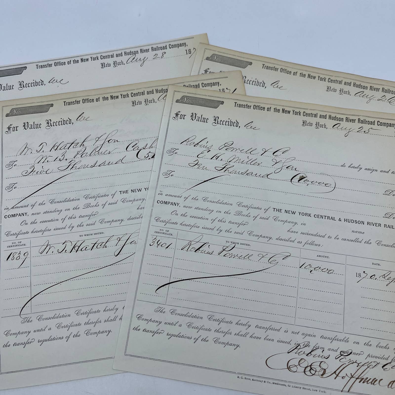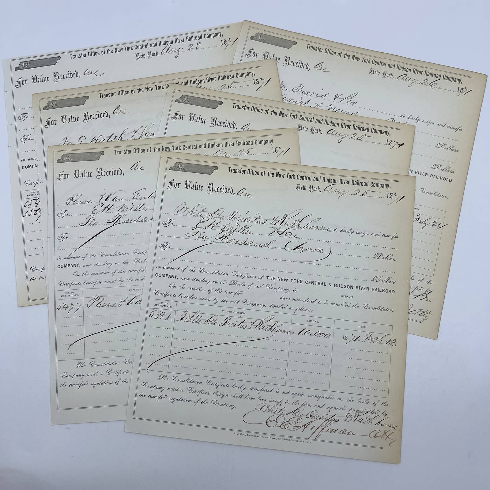 1871 New York Central & Hudson River Railroad Co Transfer Documents Set of 6 AC9