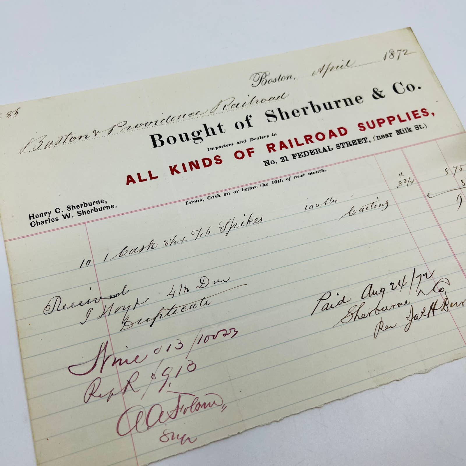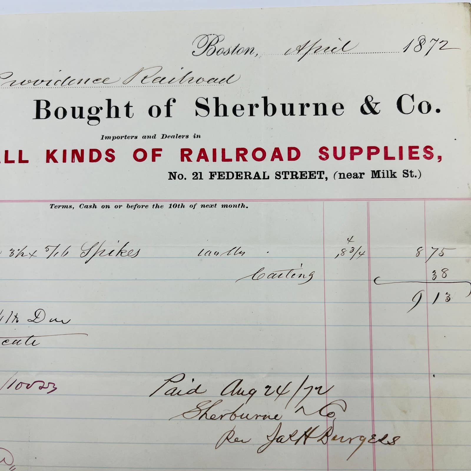 1872 Boston & Providence Railroad Sherburne & Co Billhead Letterhead Receipt AA4