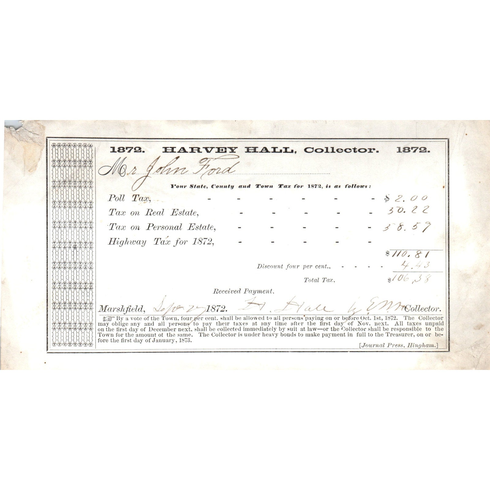 1872 Harvey Hall Tax Collection Receipt Marshfield MA John Ford AF2-A3