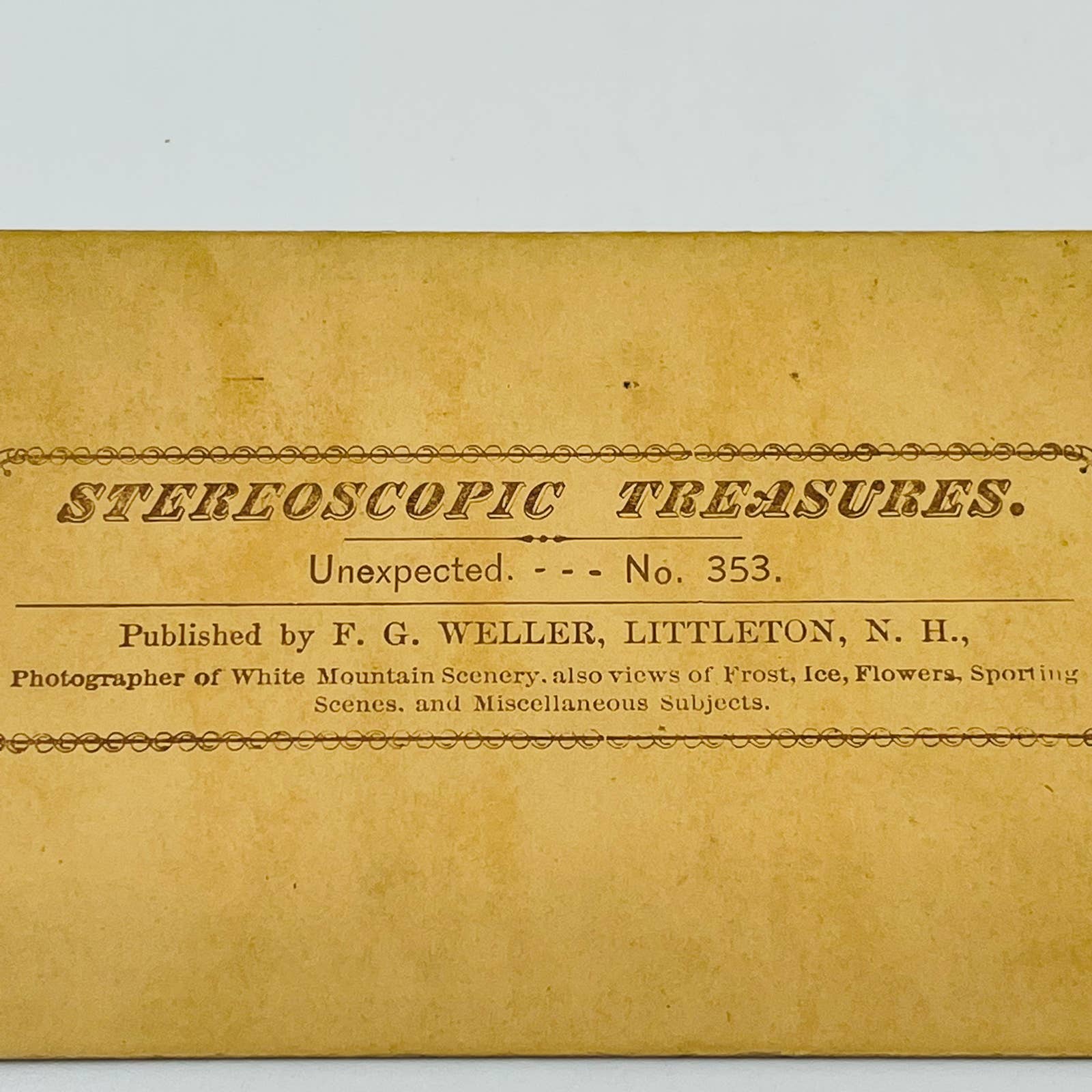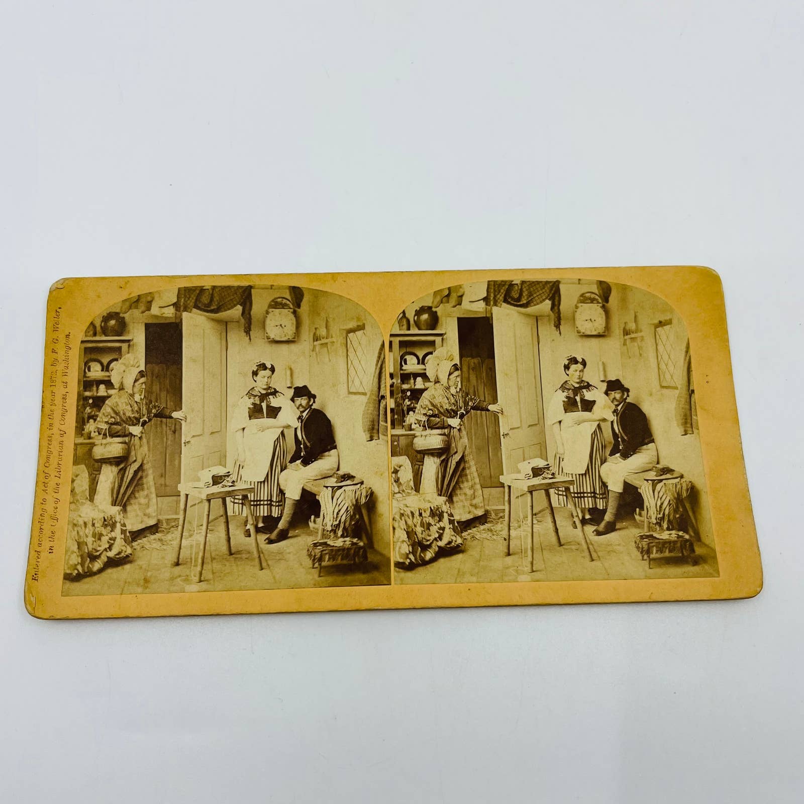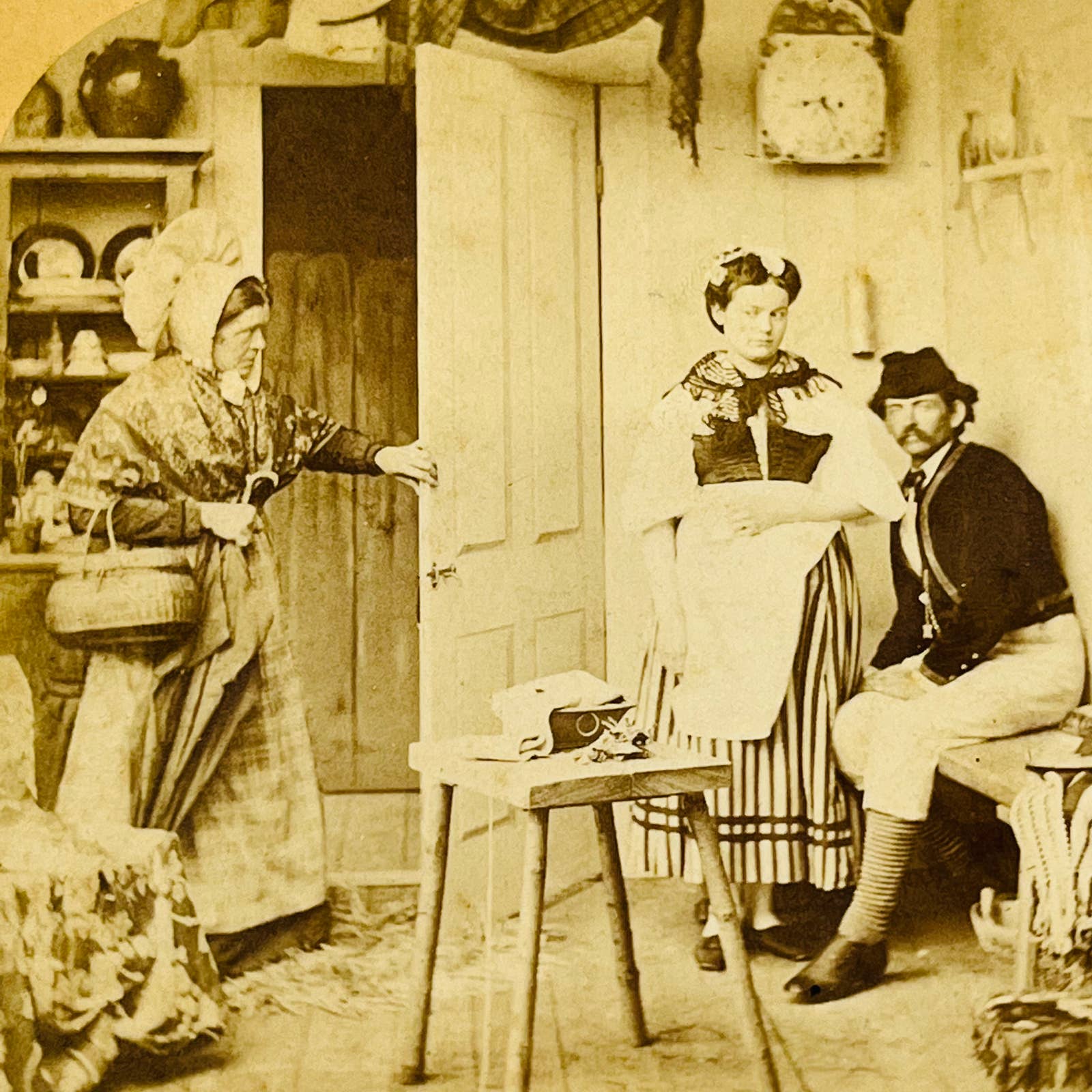 1872 Stereoview Card Unexpected - Couple and Mother in Kitchen White Mountain NH