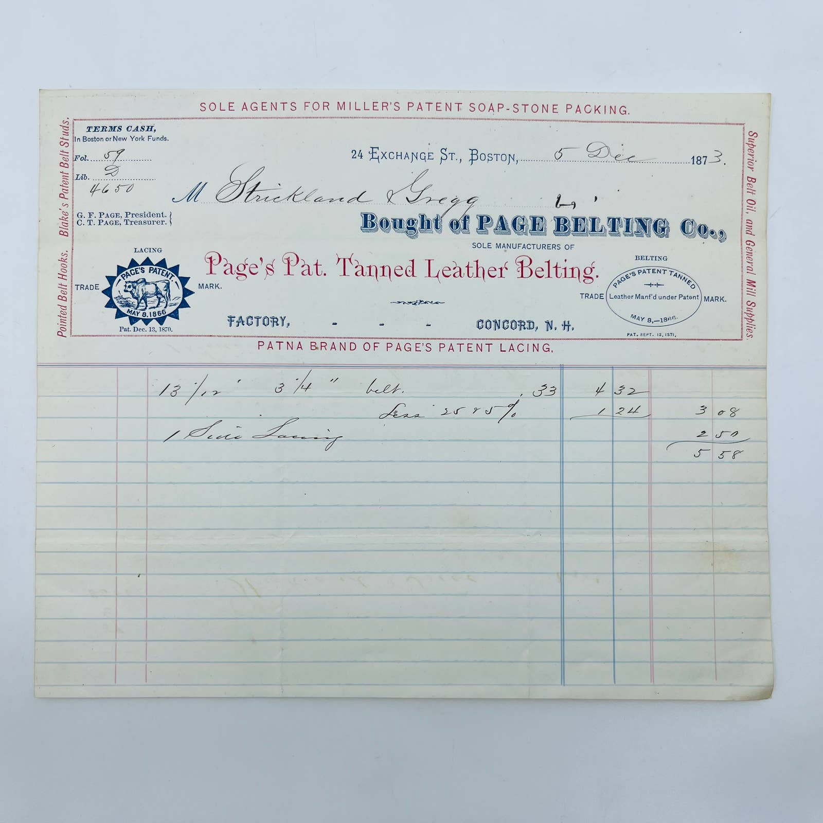 1873 Page’s Pat. Tanned Leather Belting Boston Mass. Letterhead Billhead AA5