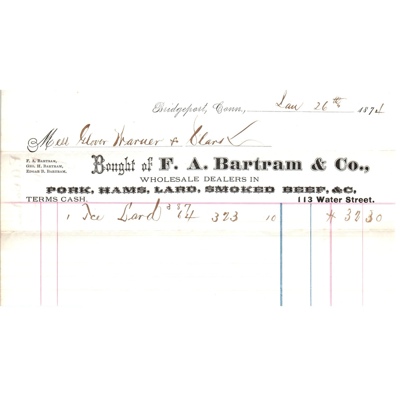 1874 F.A. Bartram & Co Meats Bridgeport CT Receipt Letterhead D24