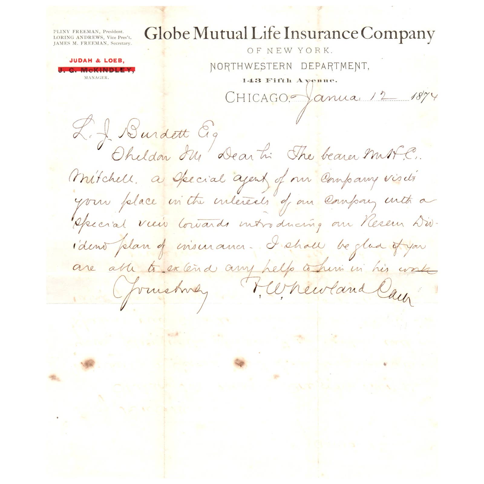1874 Globe Mutual Life Insurance of NY Letterhead Chicago Judah & Loeb AD1