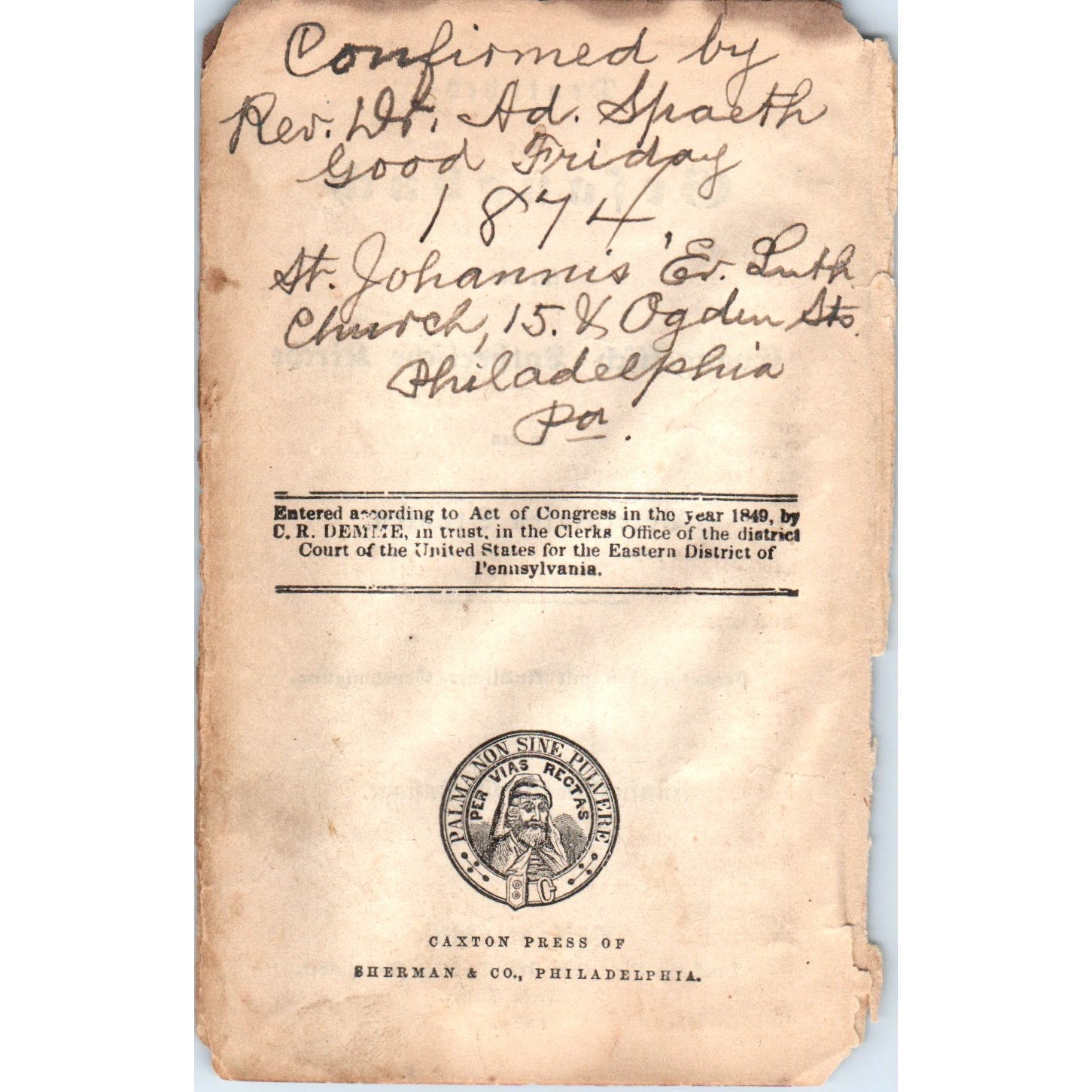 1874 Handwritten Confirmation by Rev Spaeth St. Johannis Ev Luth Church Philadelphia on German Pocket Book D20