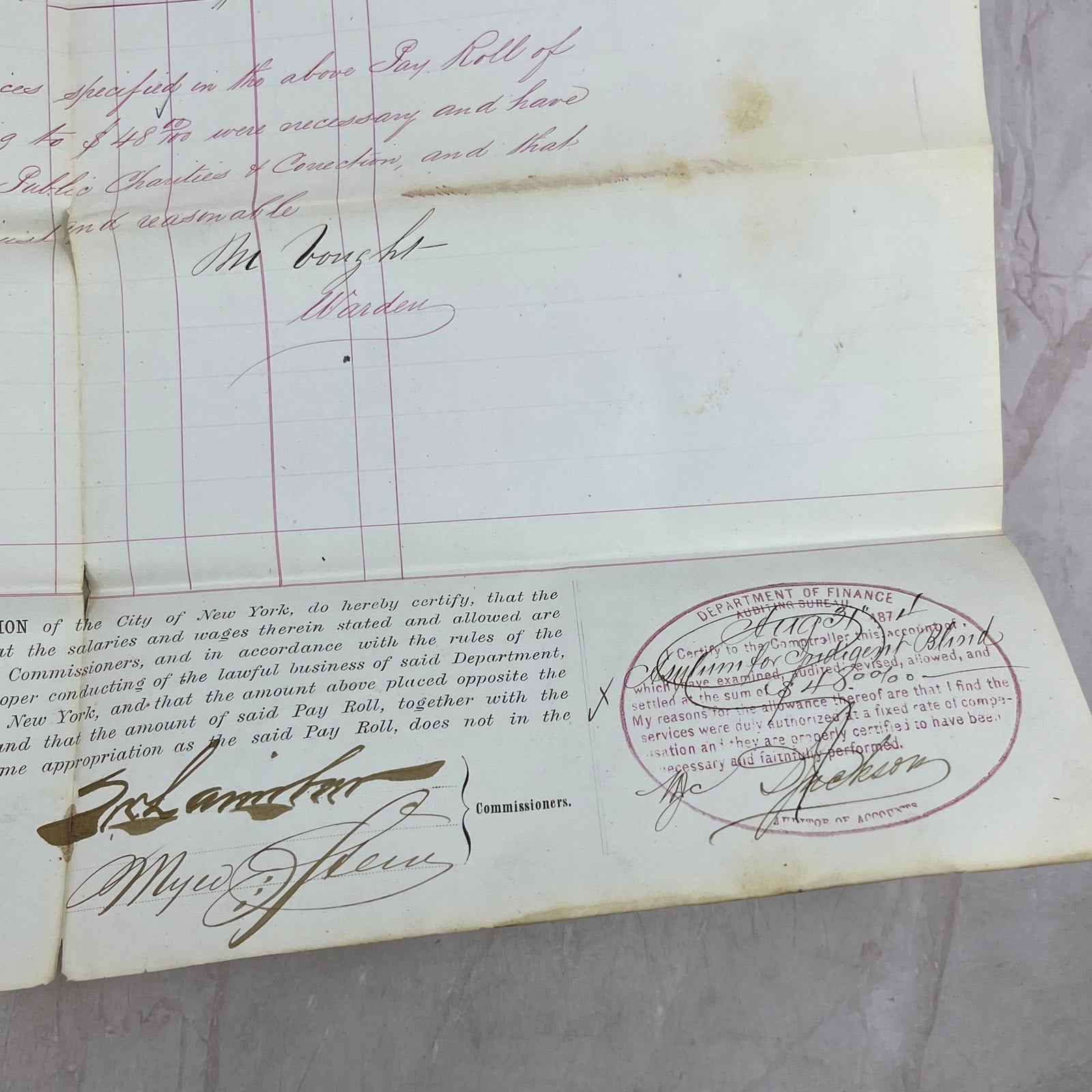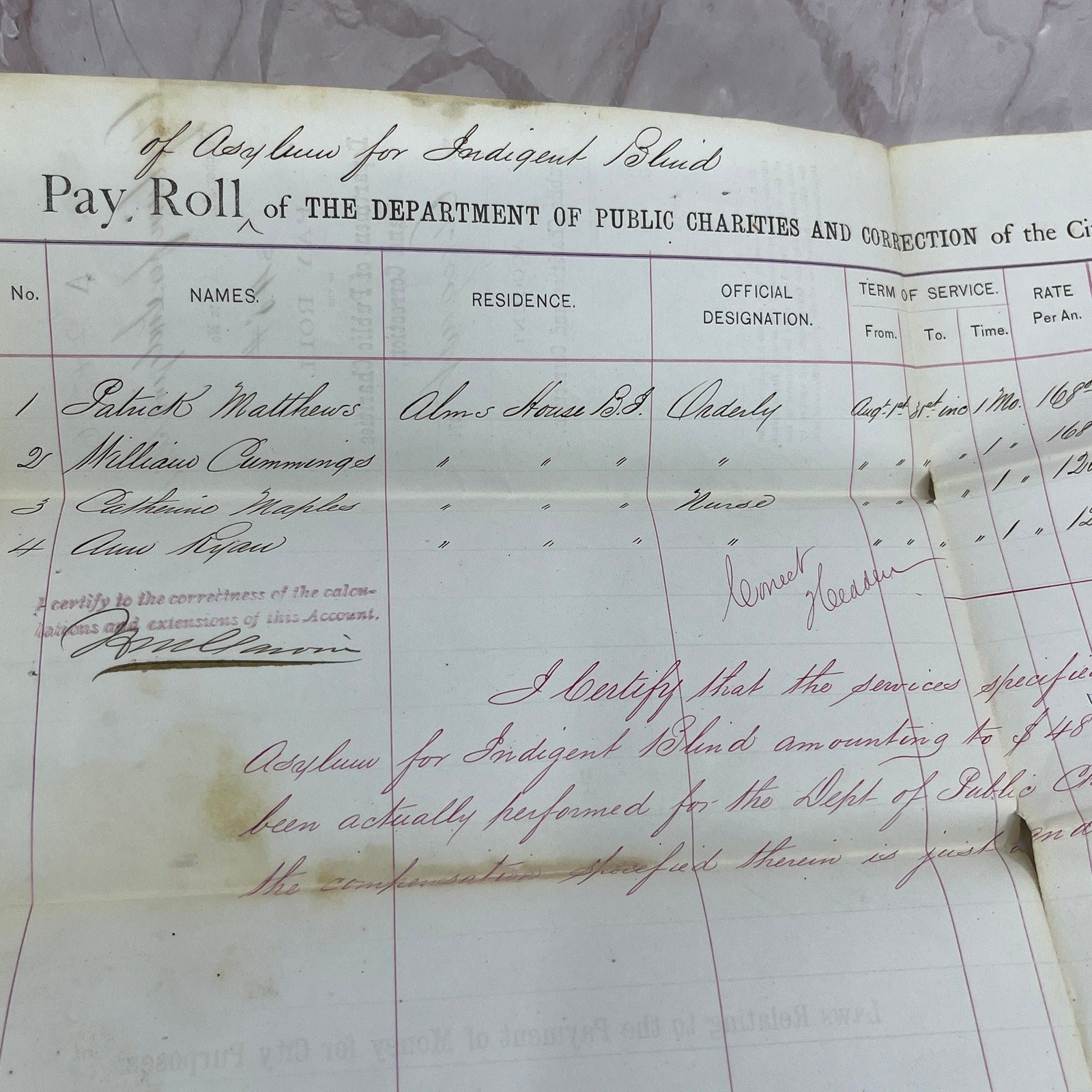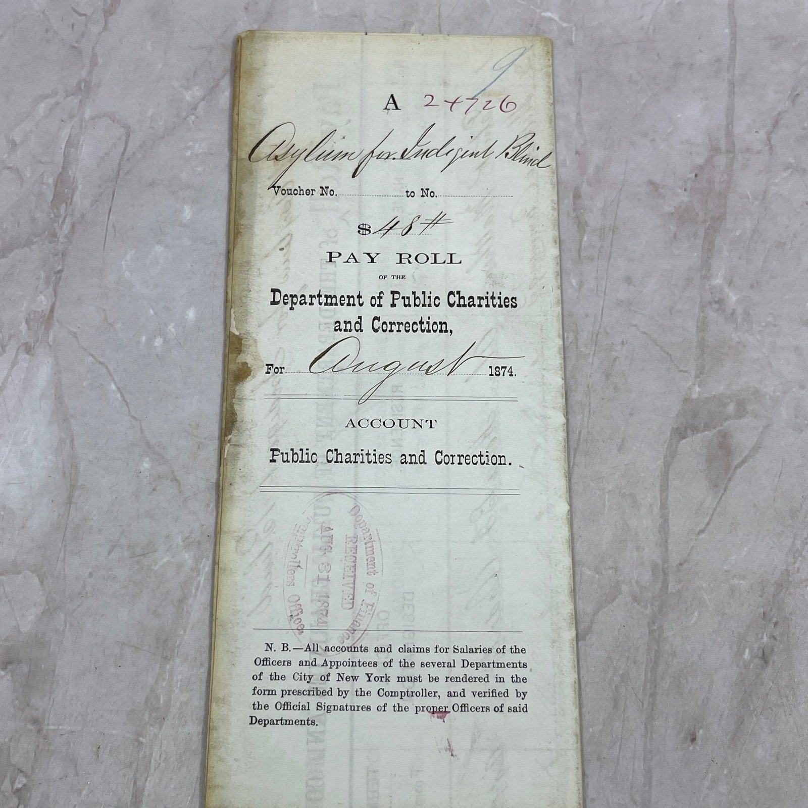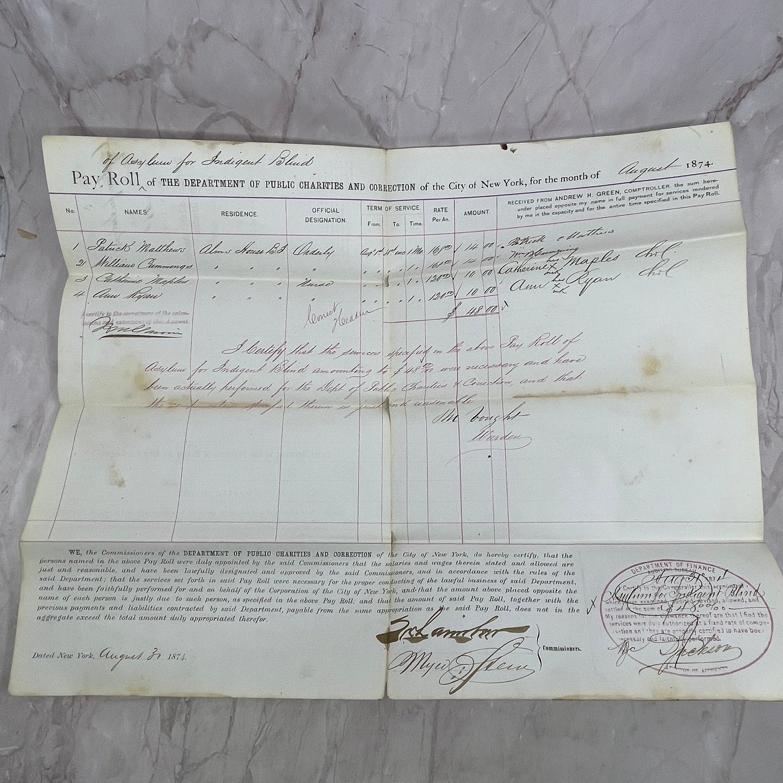 1874 NY Dept of Public Charities and Correction Payroll Asylum for Blind TJ5-E2