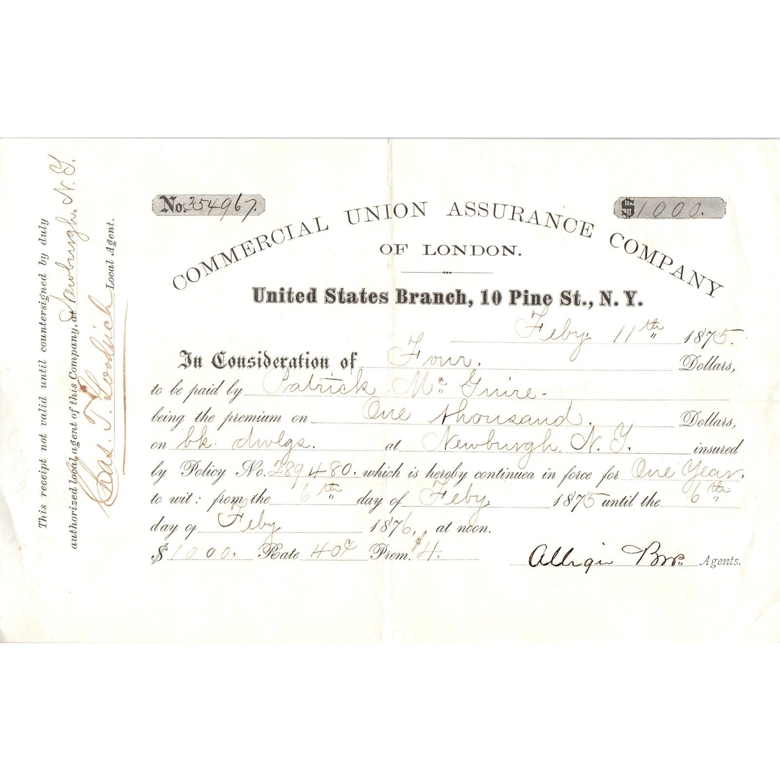 1875 Commercial Union Assurance Co of London Pine St NY Receipt Letterhead D24