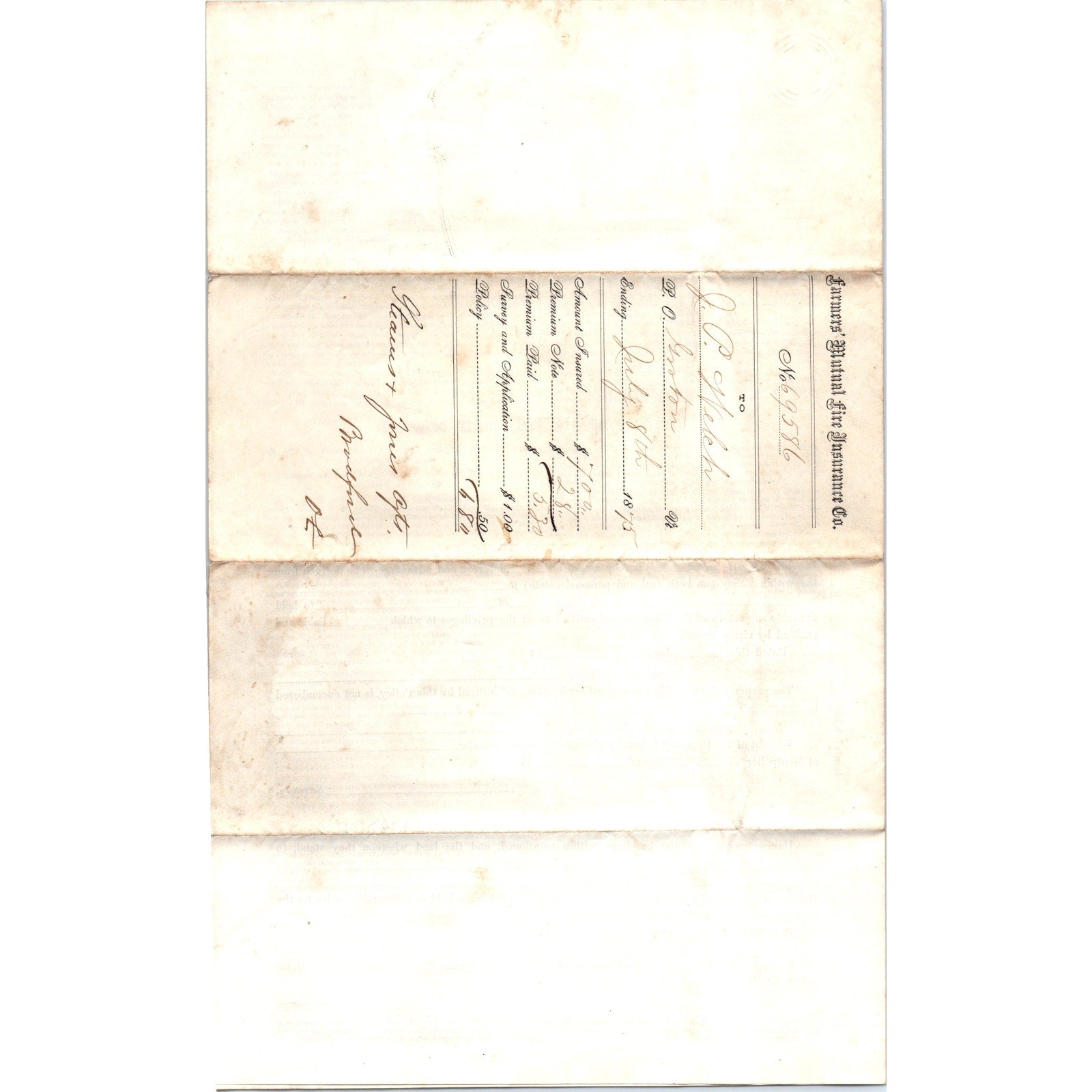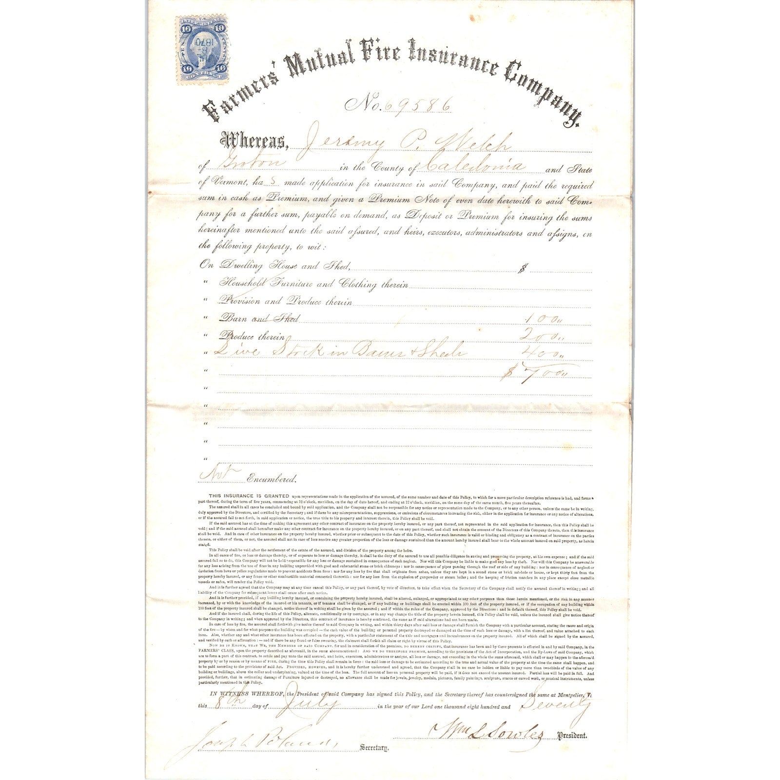 1875 Farmers Mutual Fire Ins Co Policy J.P. Welch Groton VT AF7-E7