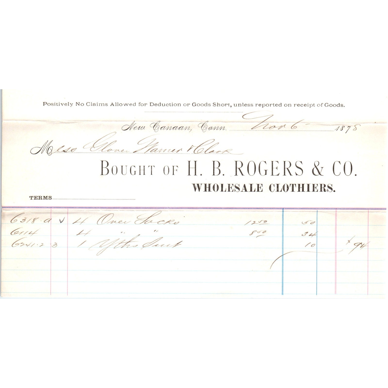 1875 H.B. Rogers & Co Clothiers New Canaan CT Receipt Letterhead D24