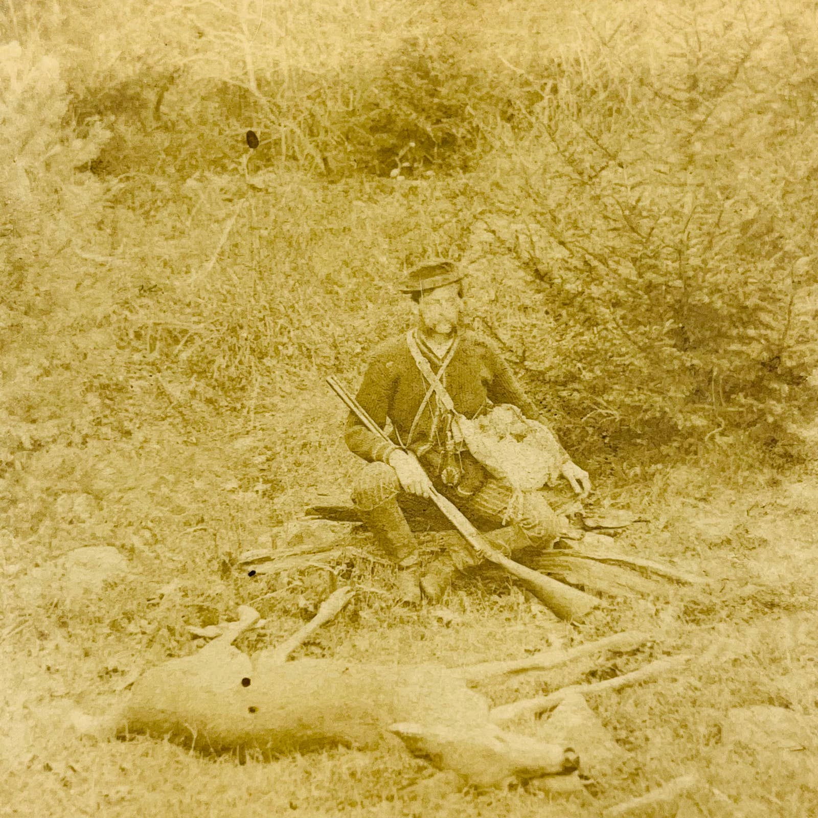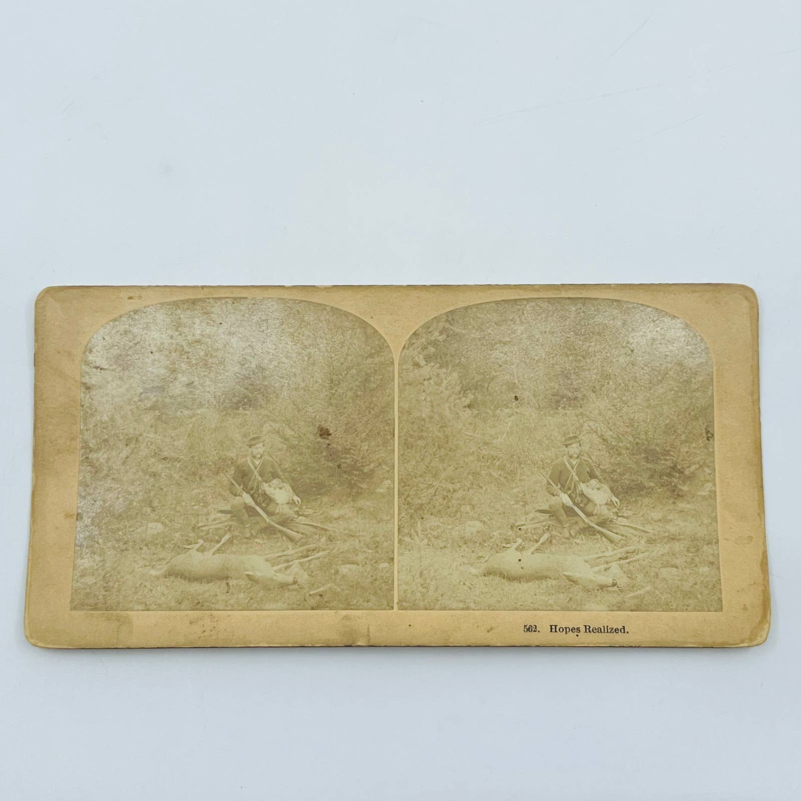 1875 Stereoview Card Victorian Deer Hunter With Rifle Standing Over Deer SB8
