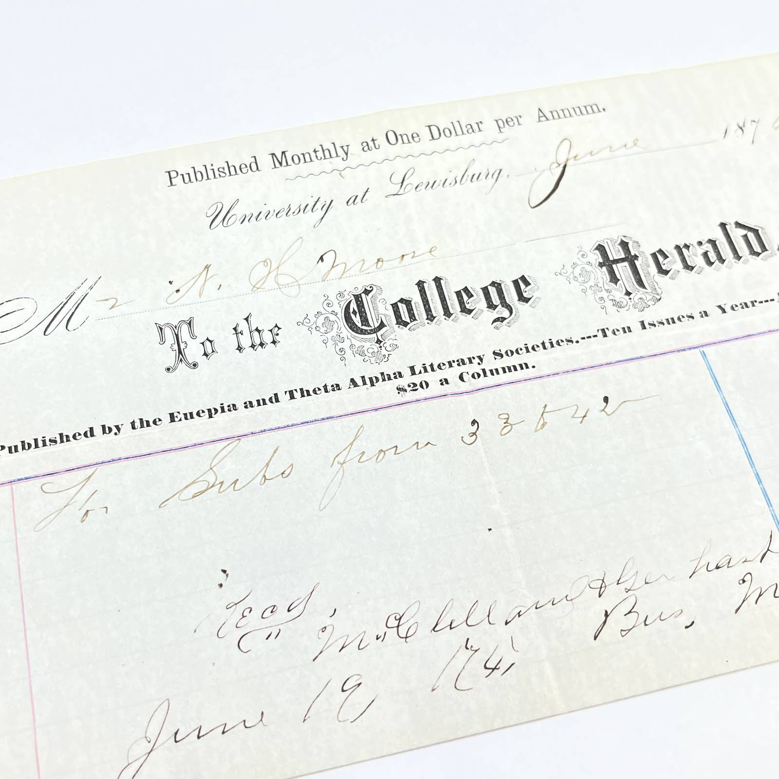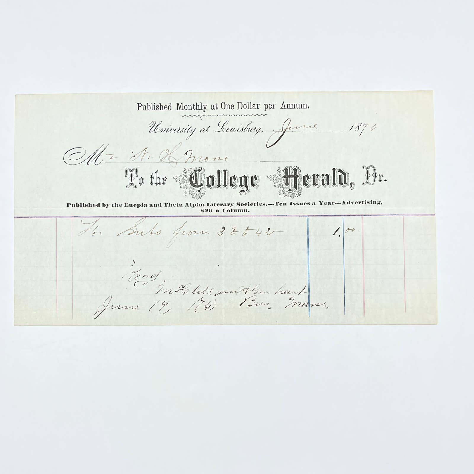 1876 University at Lewisburg Bucknell College Herald Billhead Receipt Euepia & Theta Alpha Literary Society AC2