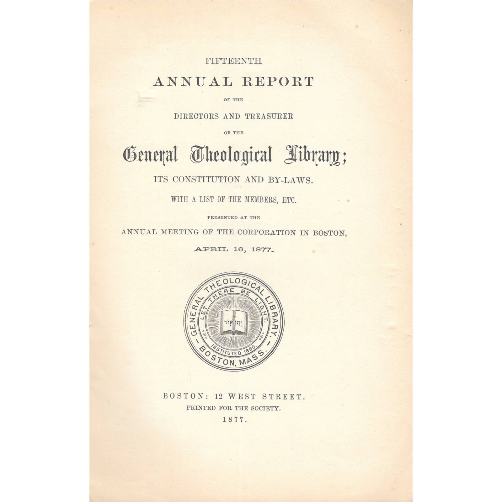 Fifteenth Annual Report Directors And Treasurer of The General Theological Library Its Constitution And By-laws With A List Of The Members, Etc. Annual Meeting Of The Corporation In Boston, April 16, 1877.