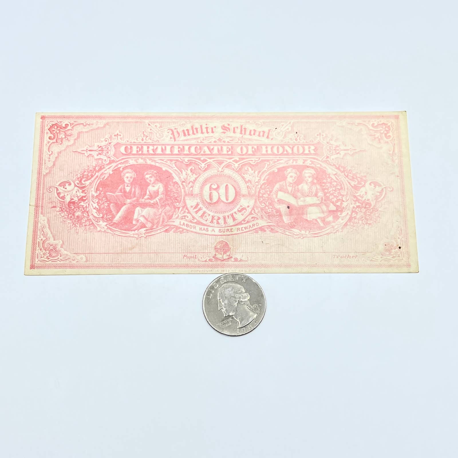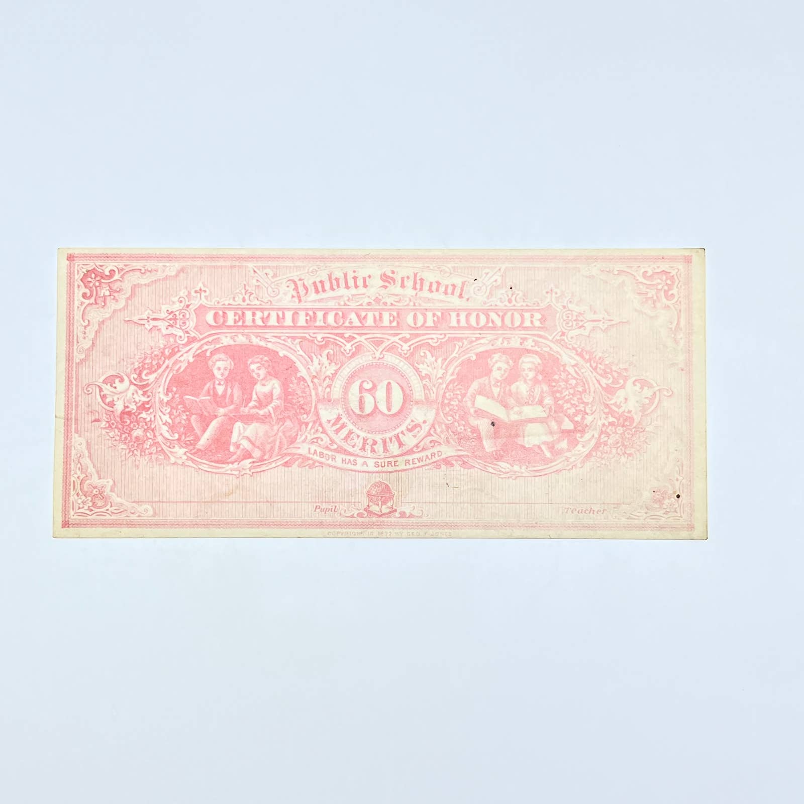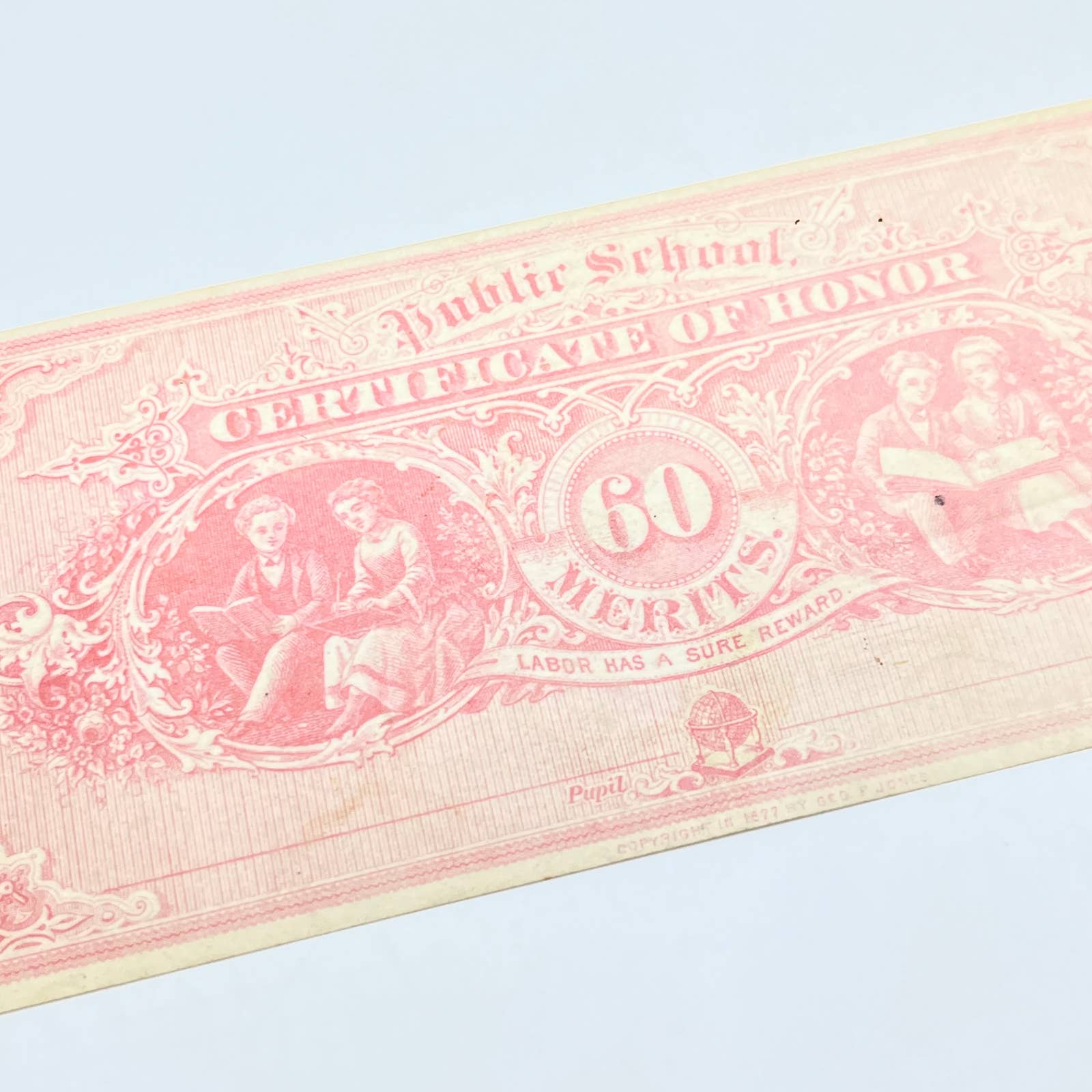 1877 Public School Certificate of Merit Labor Sure Has A Reward 60 Merits AB8