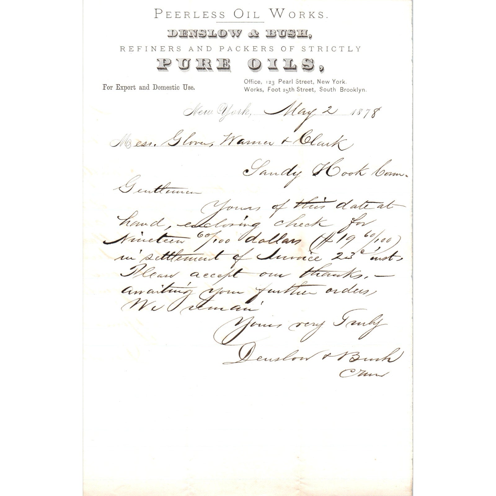 1878 Densow & Bush Peerless Oil Works New York Receipt Letterhead D24
