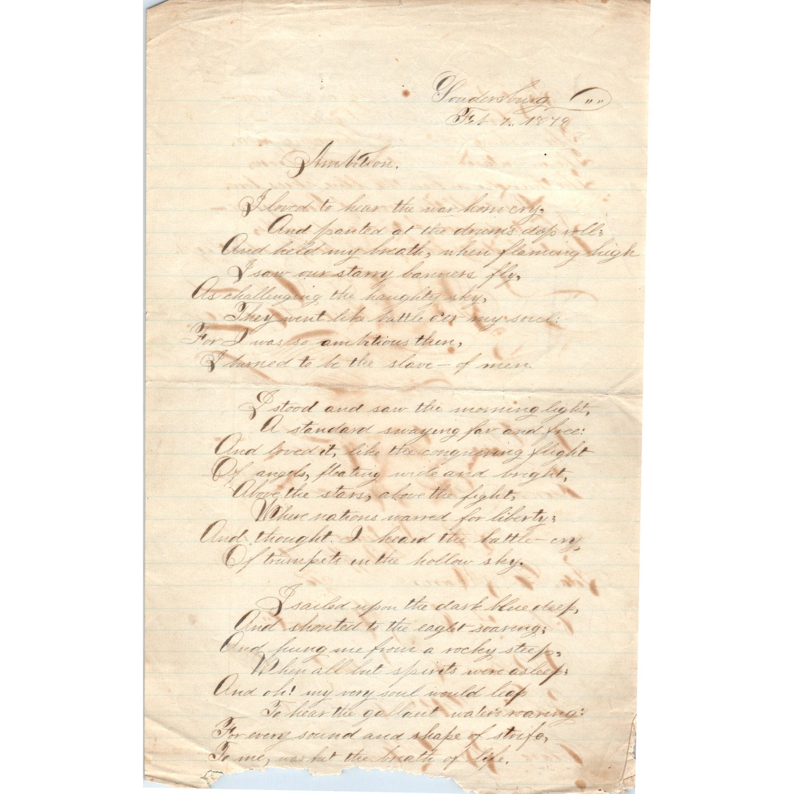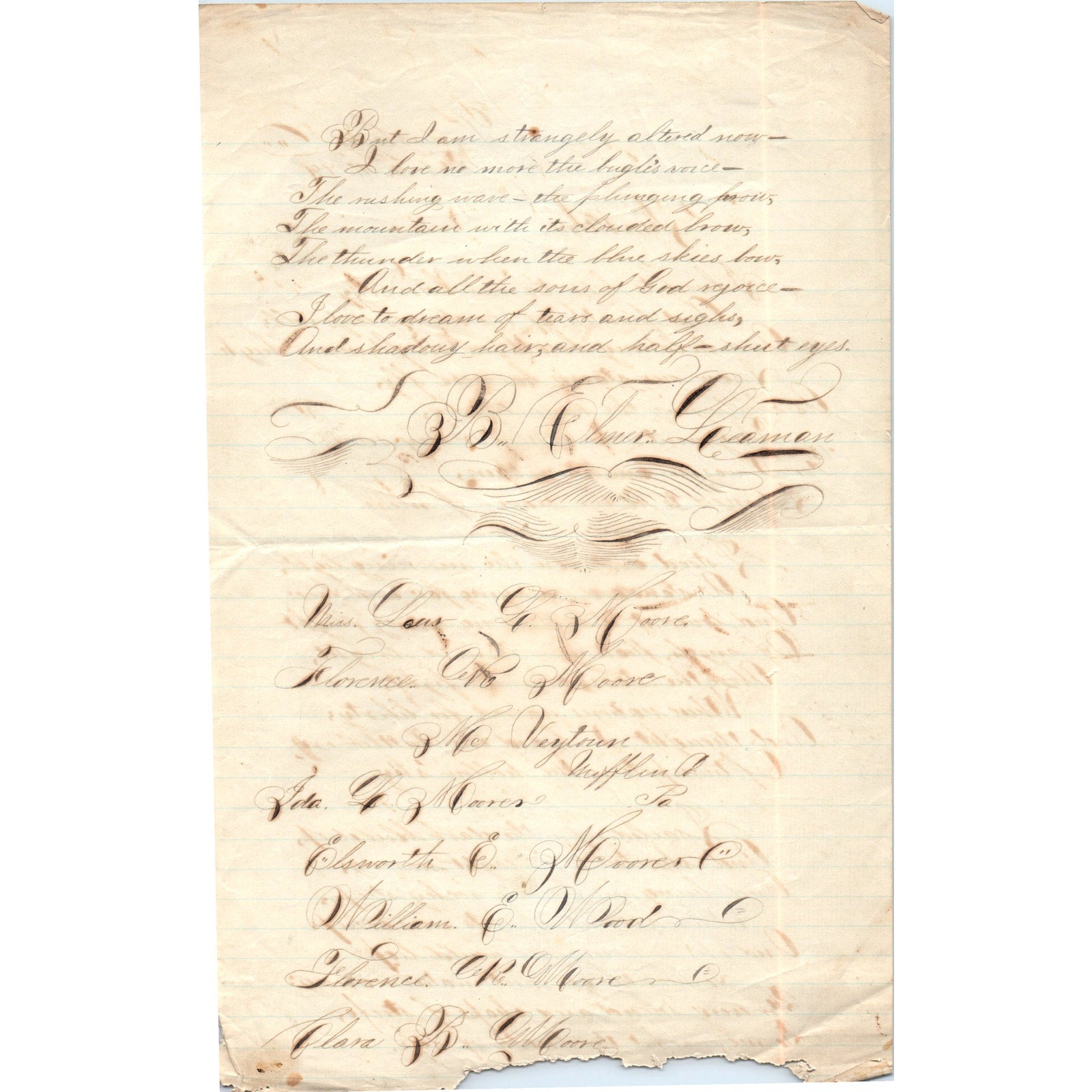 1878 Handwritten Letter - Possibly Schoolwork - Poetry - Soudersburg PA B. Elmer Leaman D21