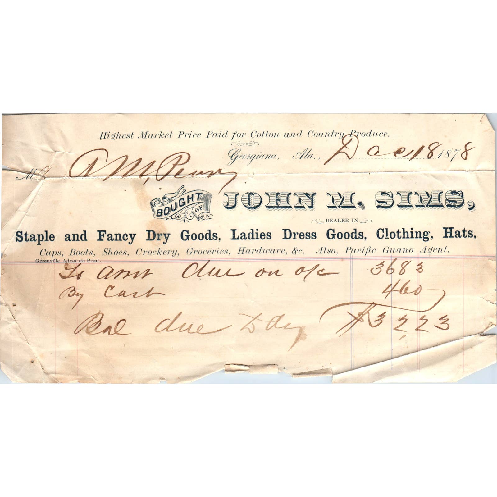 1878 Letterhead Billhead John M. Sims Dry Goods Georgiana AL AD6-3