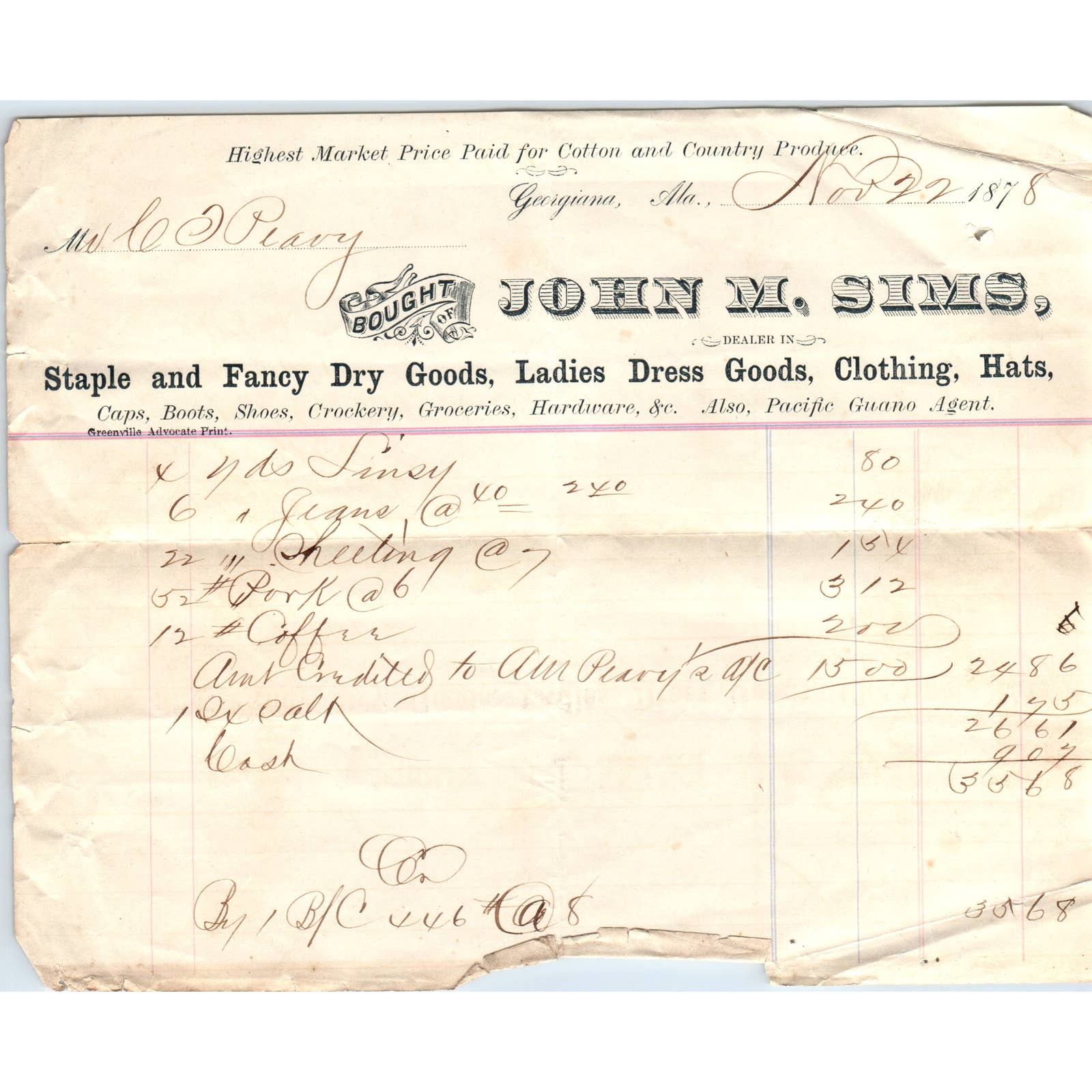 1878 Letterhead Billhead John M. Sims Dry Goods Georgiana AL AD6-7