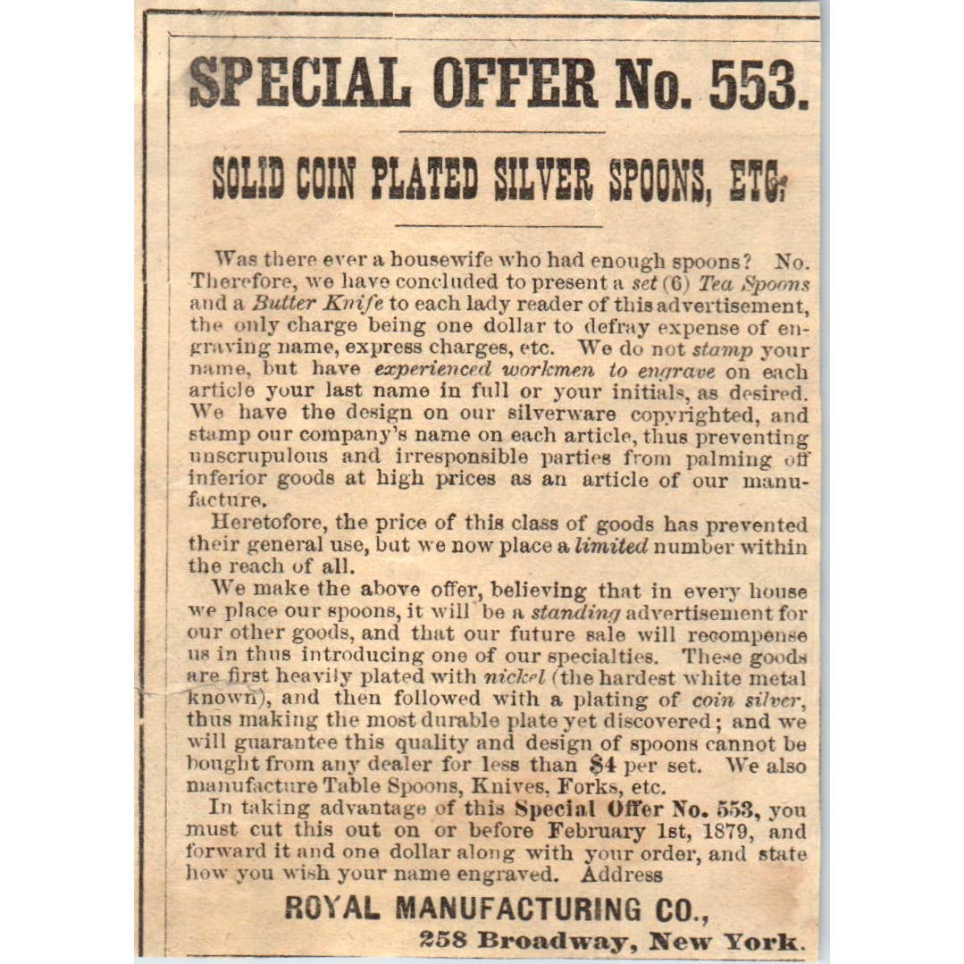 1878 Peterson's Magazine Ad Coin Plated Silver Spoons Royal Manufacturing NY SF2