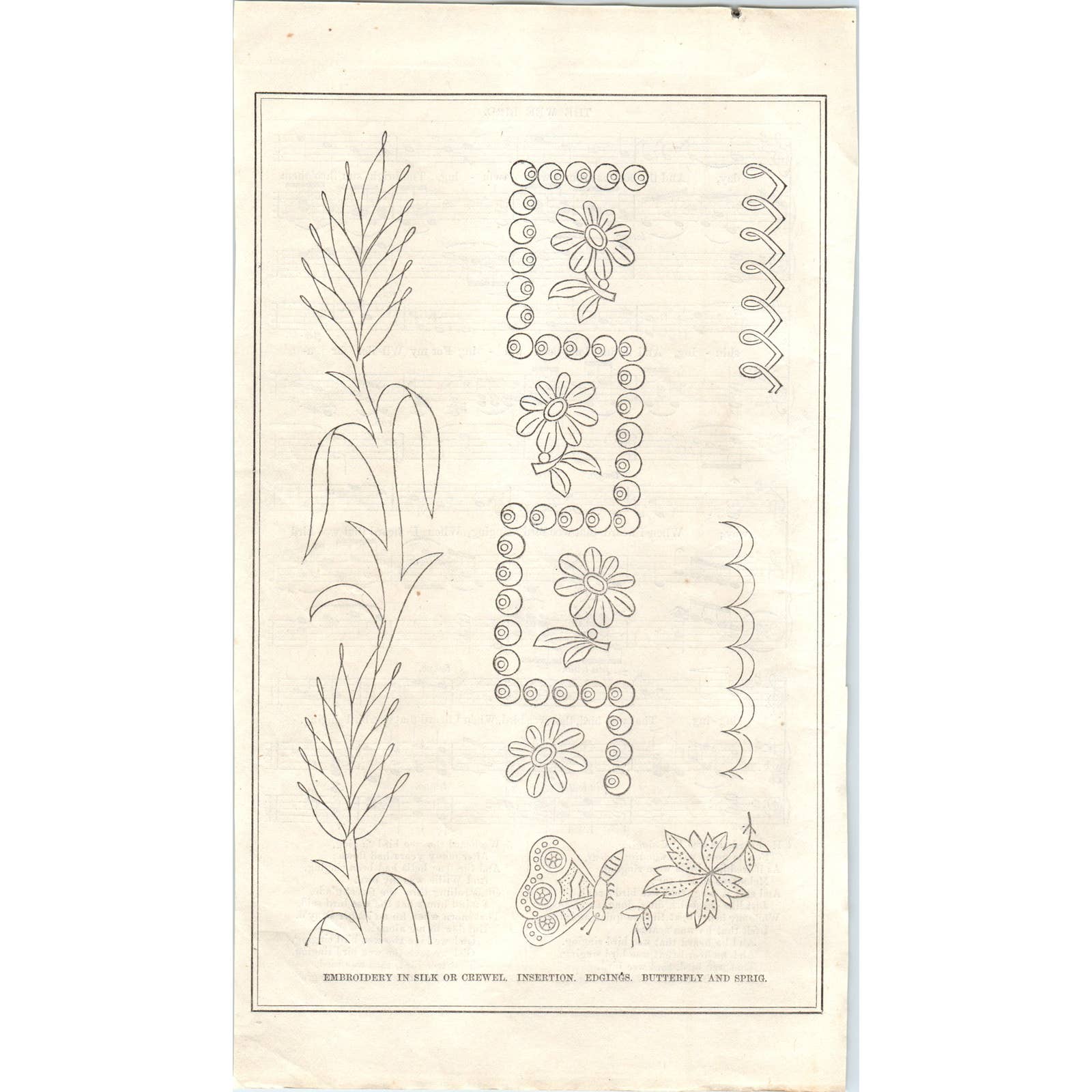 1878 Victorian Engraving Embroidery in Silk or Crewel Insertion Edgings Butterfly & Sprig SF2