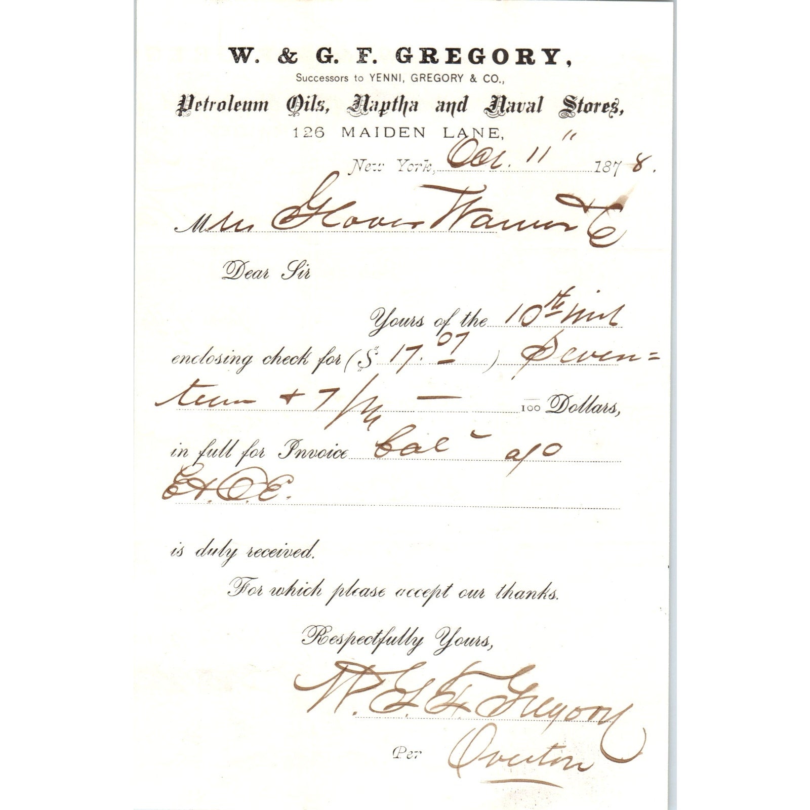1878 W & G.F. Gregory Petroleum Maiden Lane NY Receipt Letterhead D24