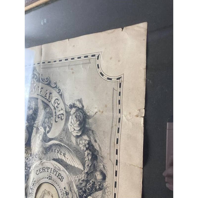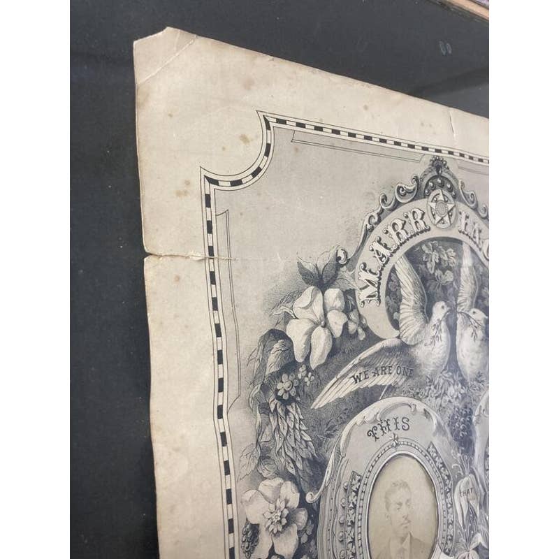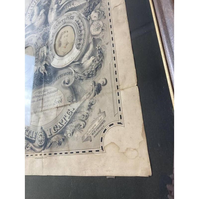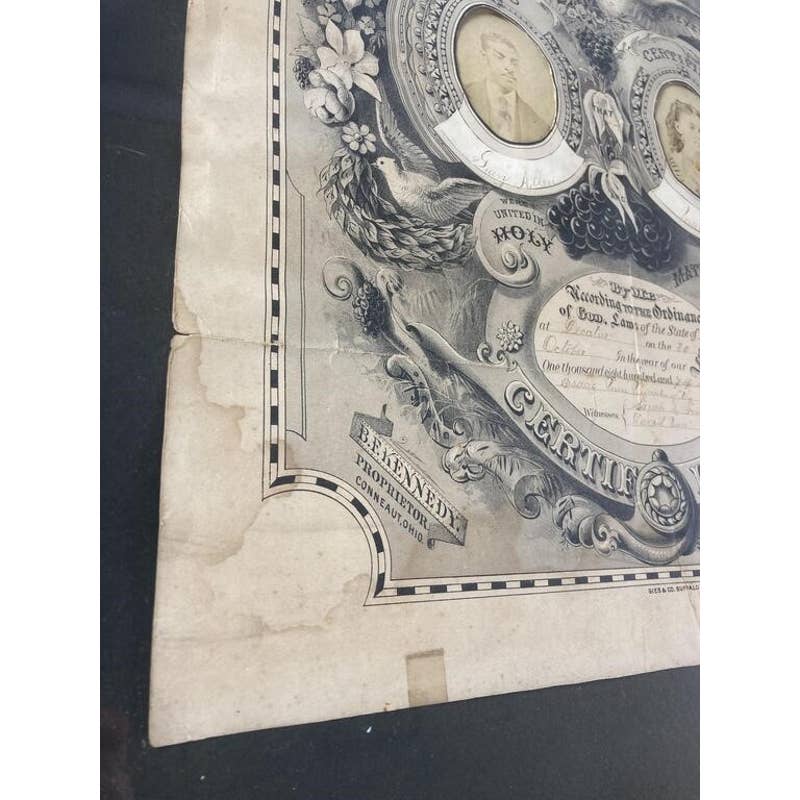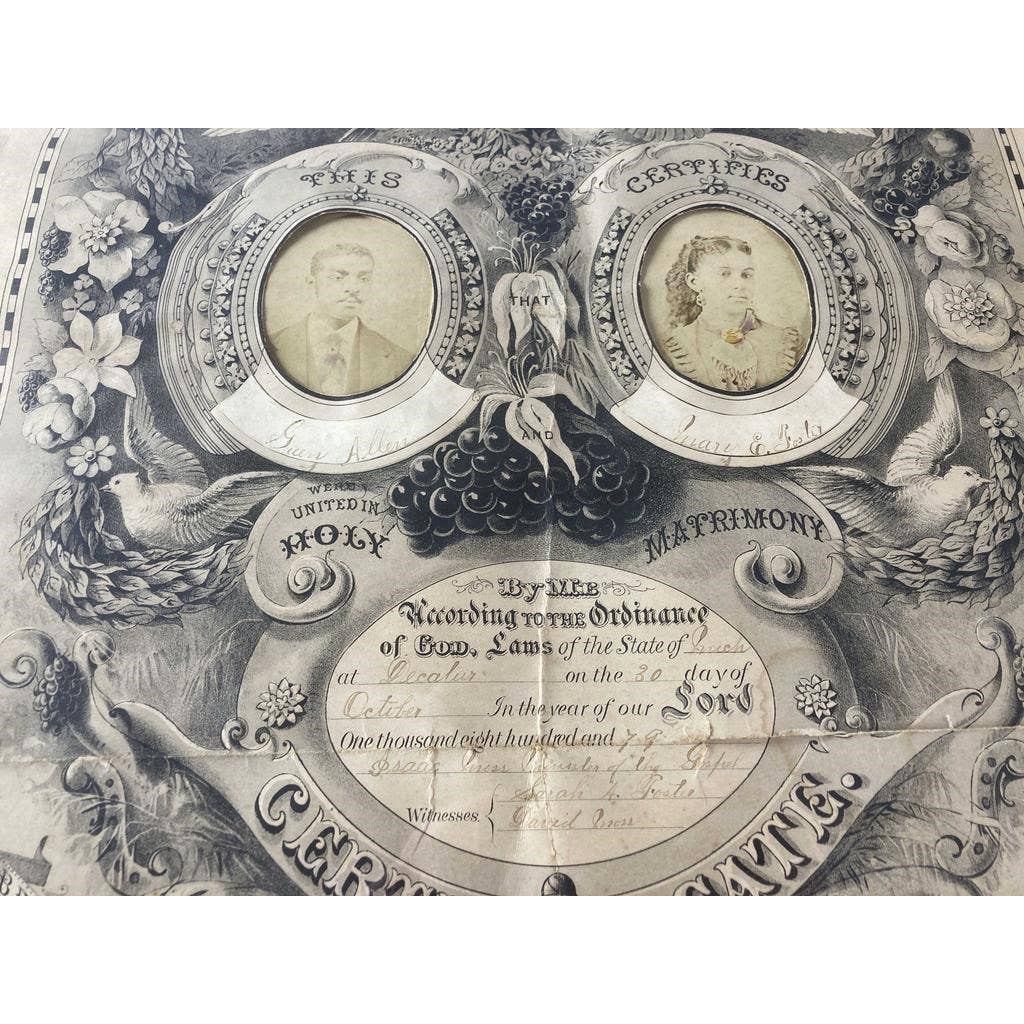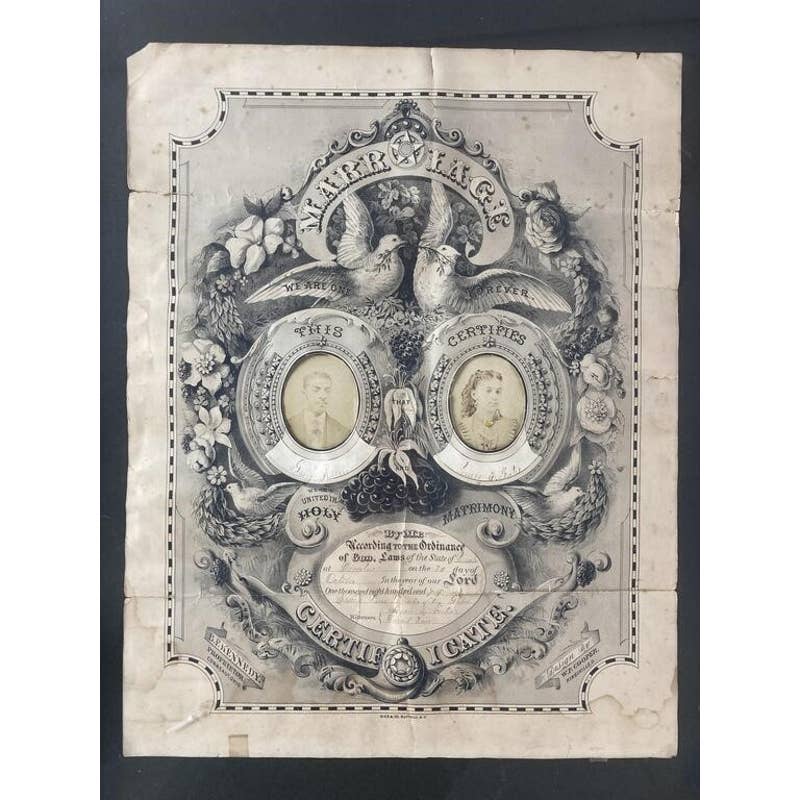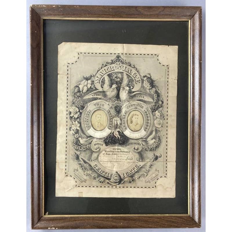 Amazing rare Victorian piece. Green Allen and Mary Foster's wedding certificate from 1879. Certificate is framed and includes signatures and photographs of the couple. Certificate is 19 X 14 1/2 inches in size, Certificate with frame is 26 1/2 X 20 inches in size. CONDITION: Some fading, edgewear, and staining and wear to frame.
