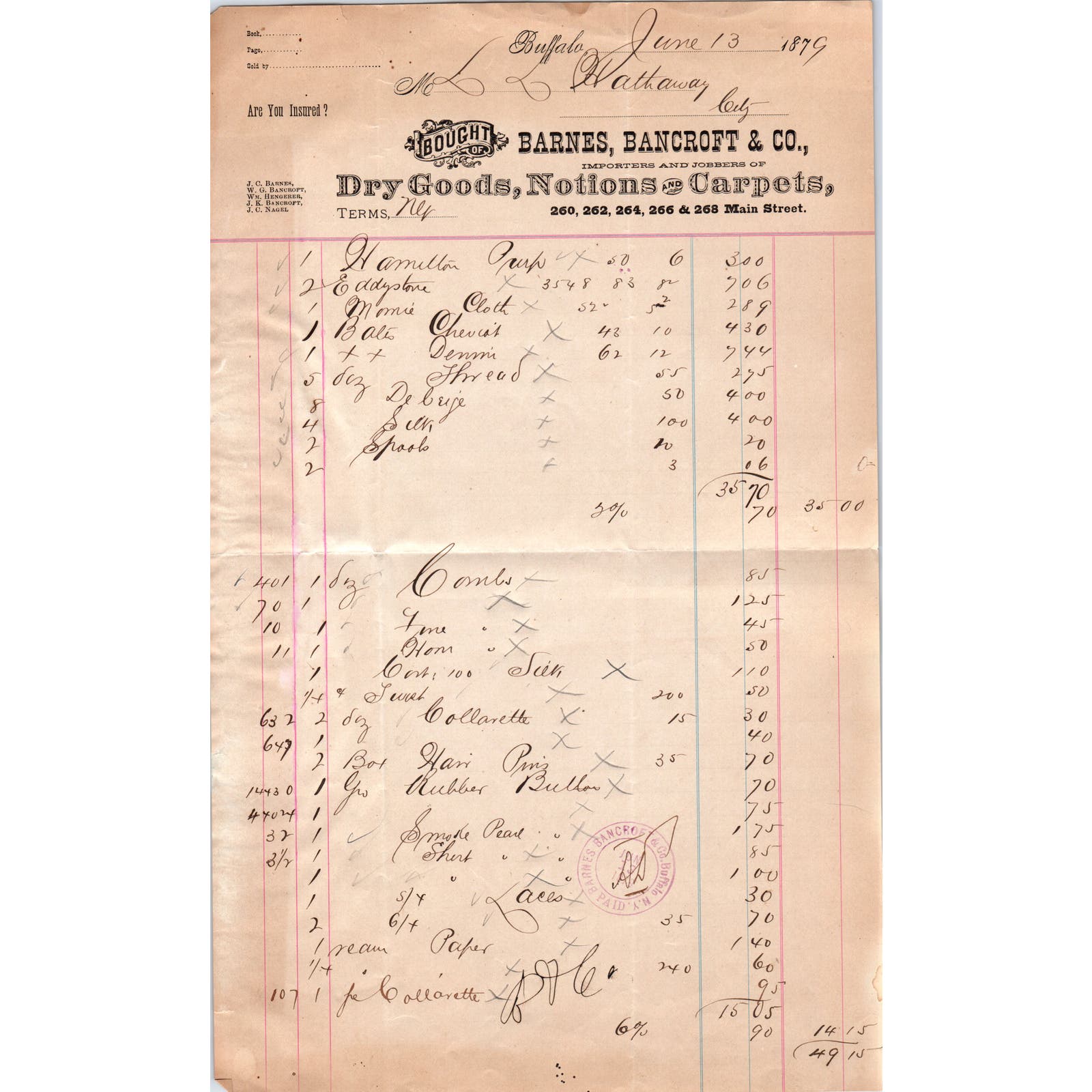 1879 Barnes, Bancroft and Co Dry Goods Buffalo NY Billhead Letterhead D17