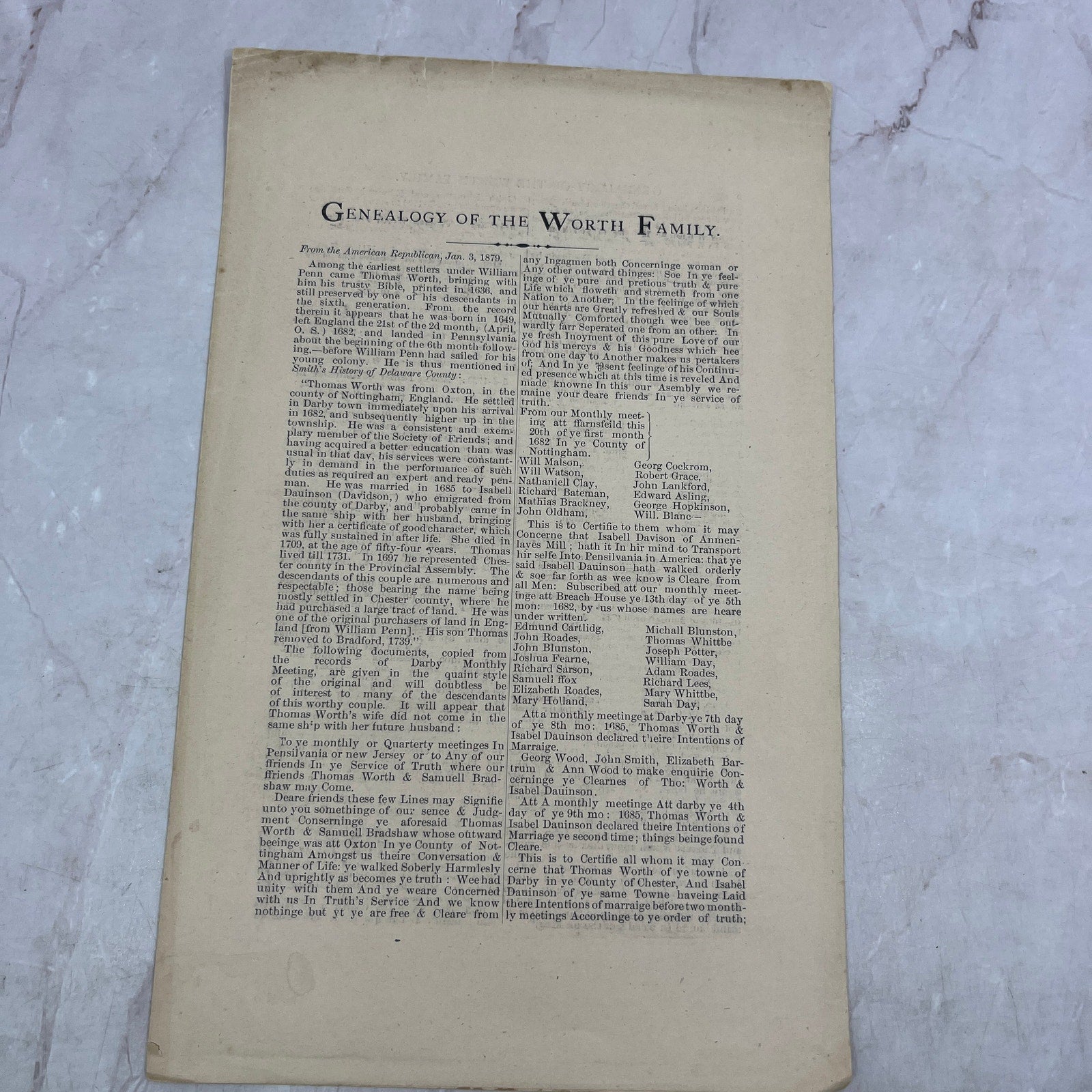 1879 Genealogy of the Worth Family Leaflet - Thomas Worth Delaware County PA D22