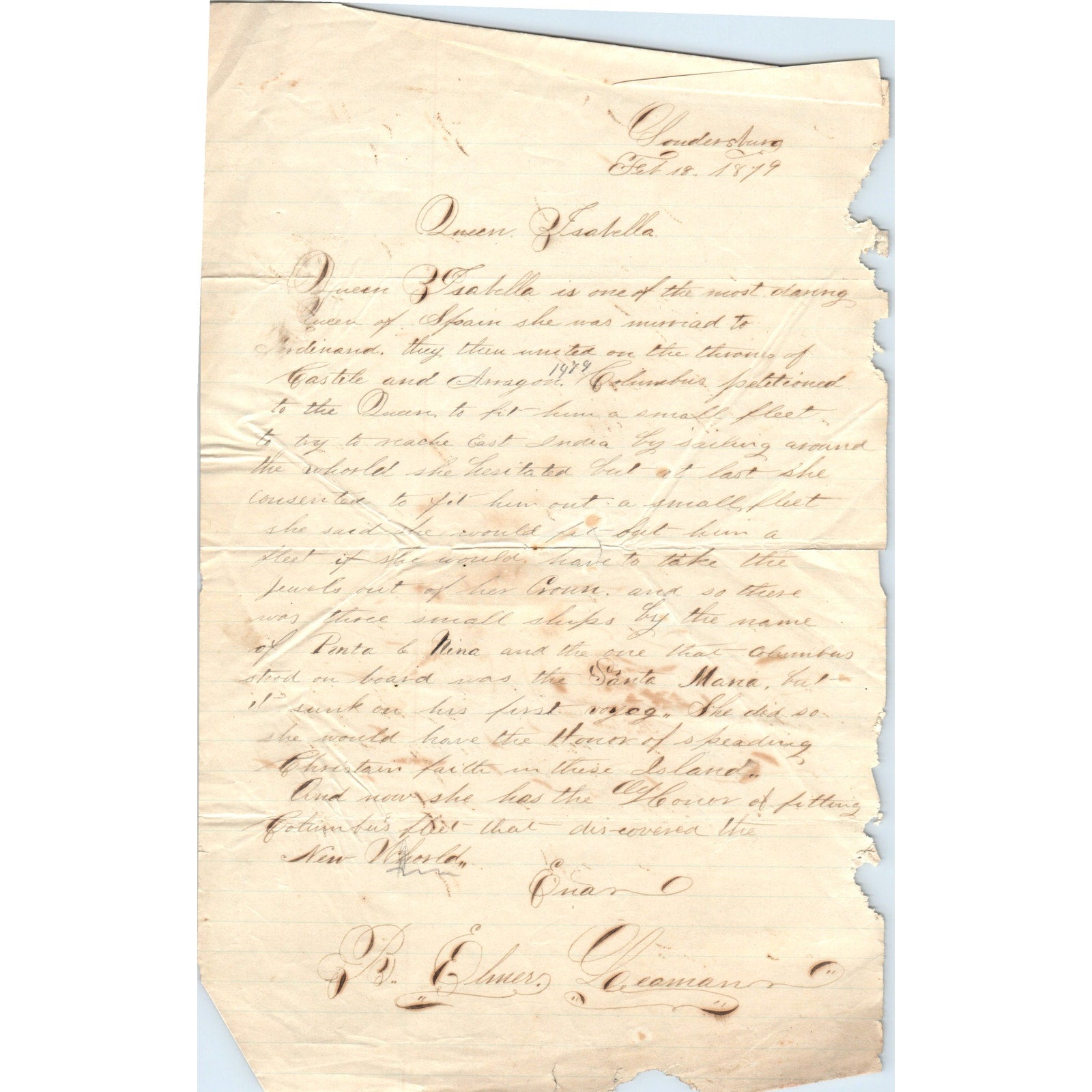 1879 Handwritten Letter - Possibly Schoolwork - Soudersburg B. Elmer Leaman D20