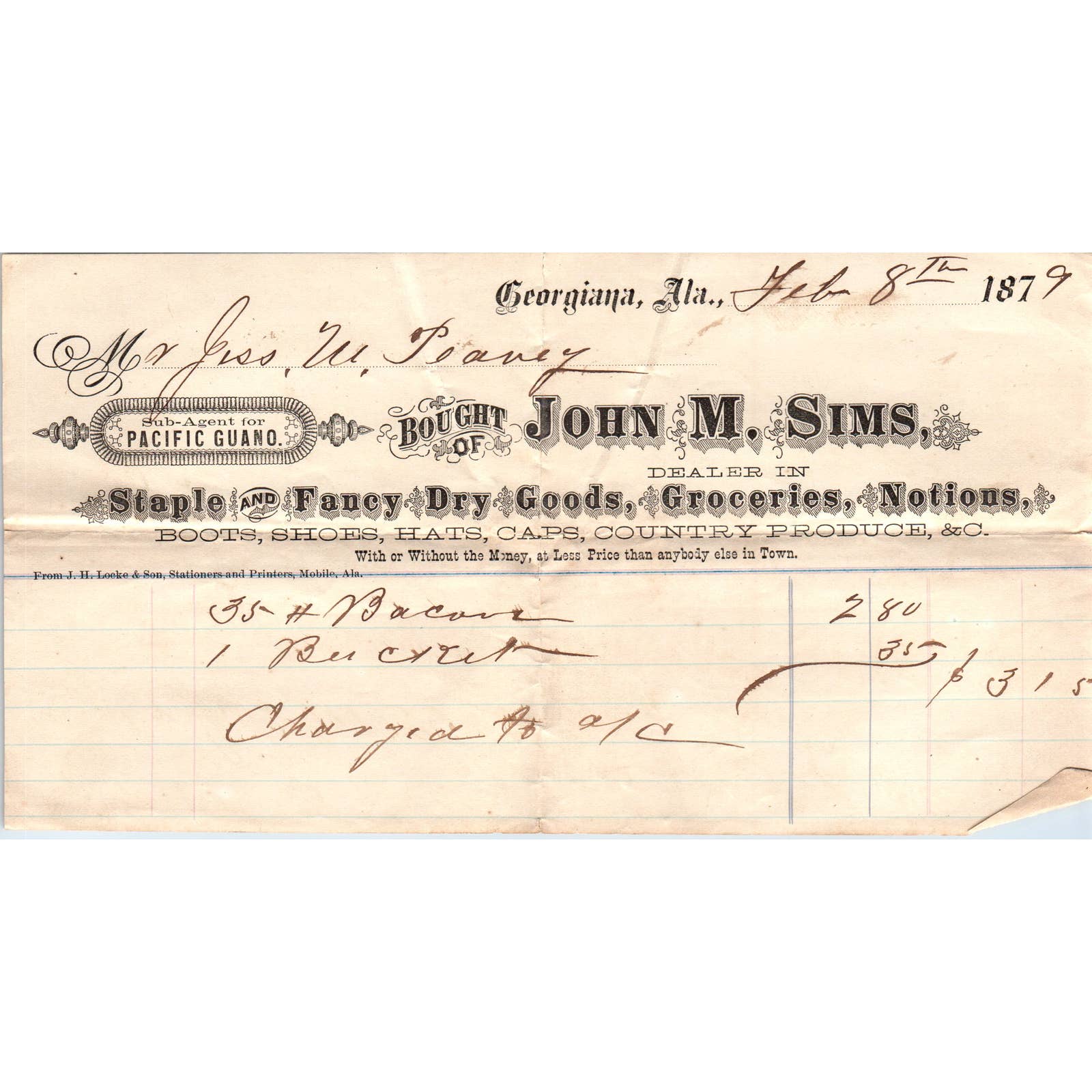 1879 Letterhead Billhead John M. Sims Dry Goods Georgiana AL AD6-2