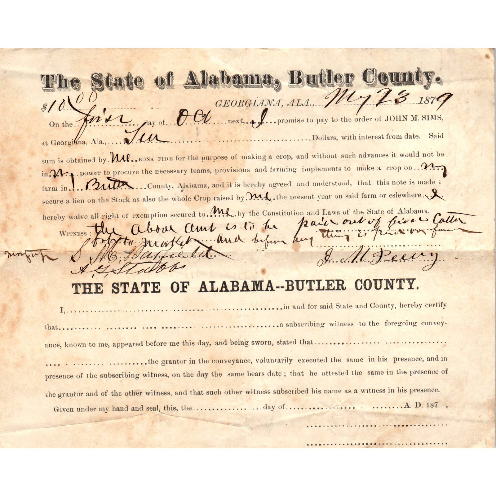 1879 State of Alabama Butler County Promissory Note Loan Agreement Georgian AD6