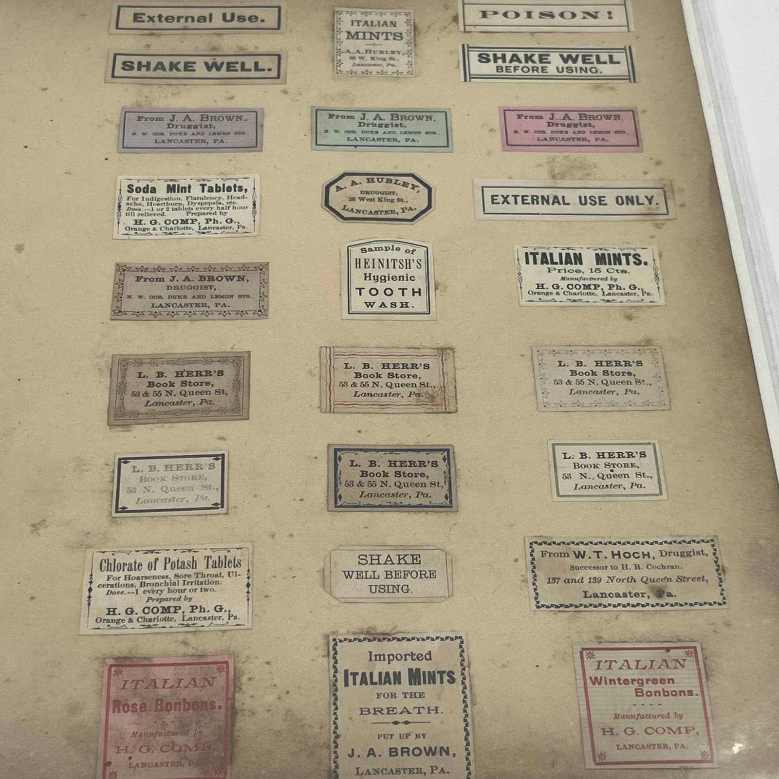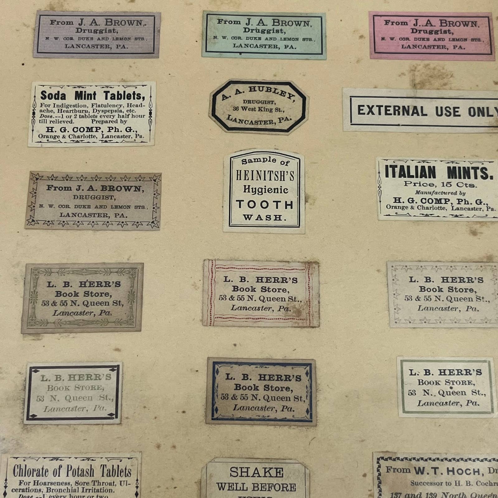Labels are glued to the paper. All products from the Lancaster PA area c1880.
