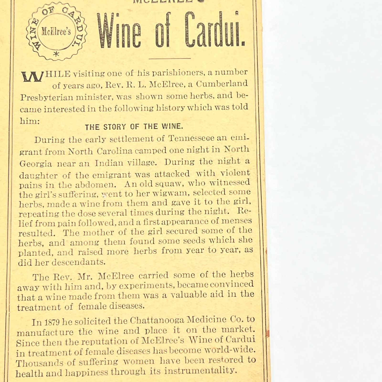 During the early settlement of Tennessee an emigrant from North Carolina camped one night in North Georgia near an Indian village. During the night a daughter of the emigrant was attacked with violent pains in the abdomen. An old squaw, who witnessed the girts sutlering, went to her wigwam, selected some herbs, made a wine from them and gave it to the girl, repeating the dose several times during the night. Re-hief from pain followed, and a first appearance of menses resulted. The mother of the girl secured some of the herbs, and among them found some seeds which she planted, and raised more herbs from year to year, as did her descendants.