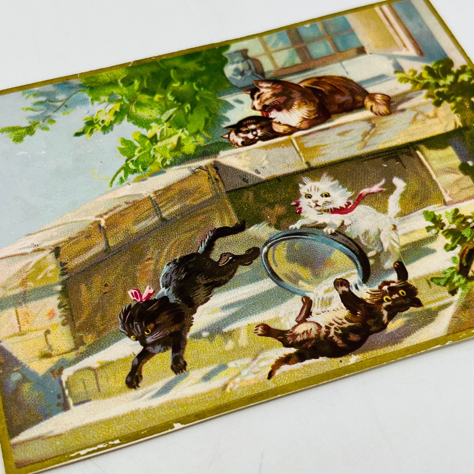 1880s Embossed Victorian Greeting Card Illustrated Kitty Cats Playing SAH9-H7