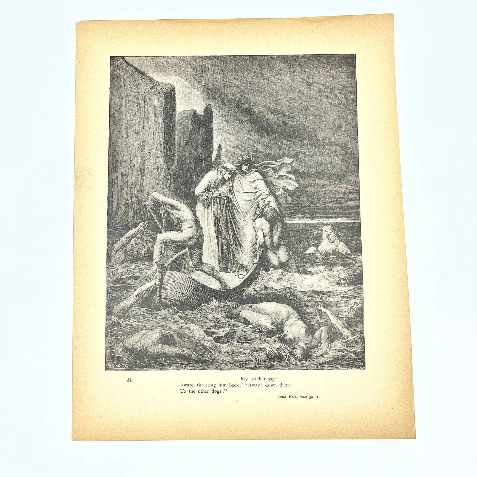 Taken from an original 1880s Divine Comedy Book of Engravings by Gustav Dore. Paper is getting brittle around the edges and may have small tearing and some spots and other signs of age, as it is near 150 years old.