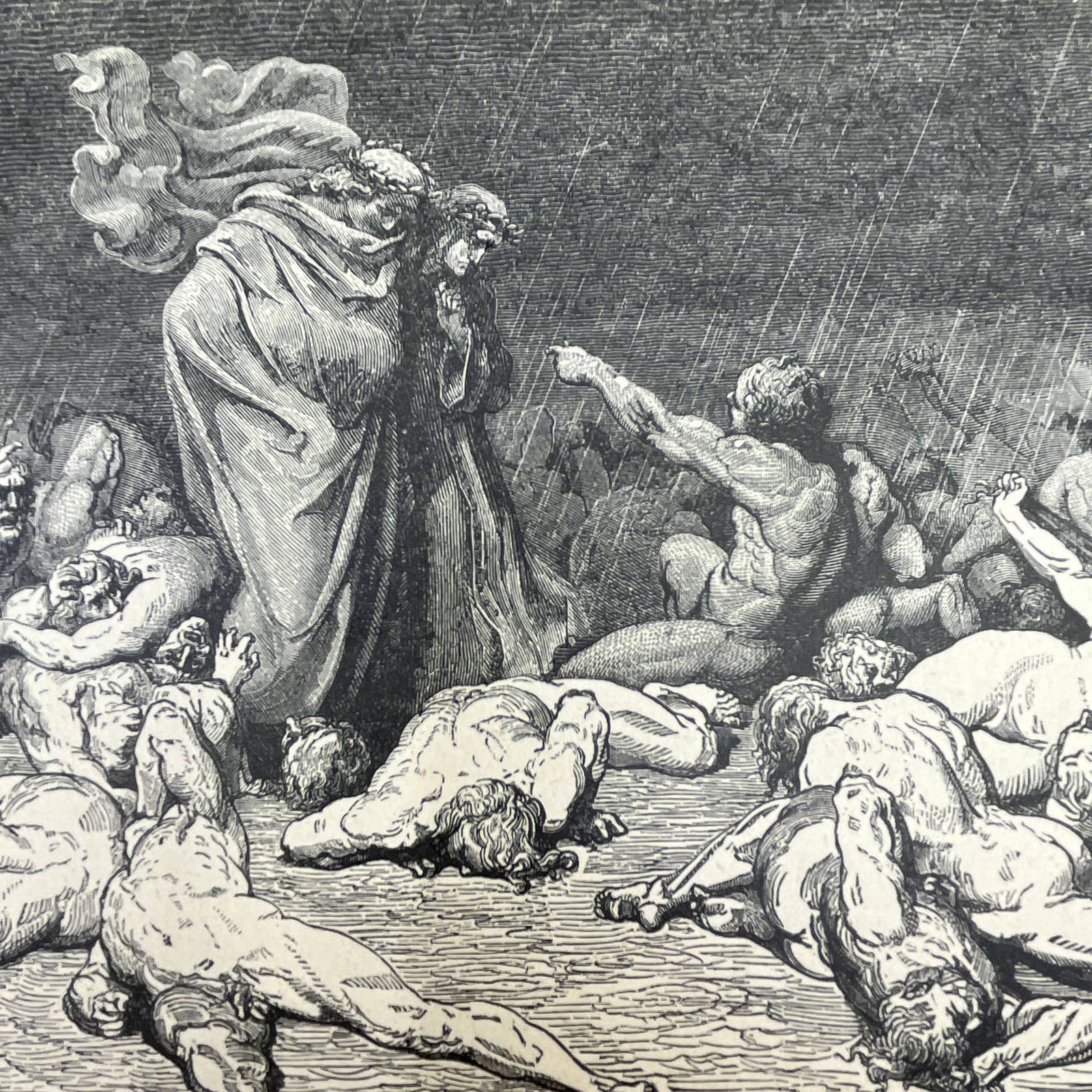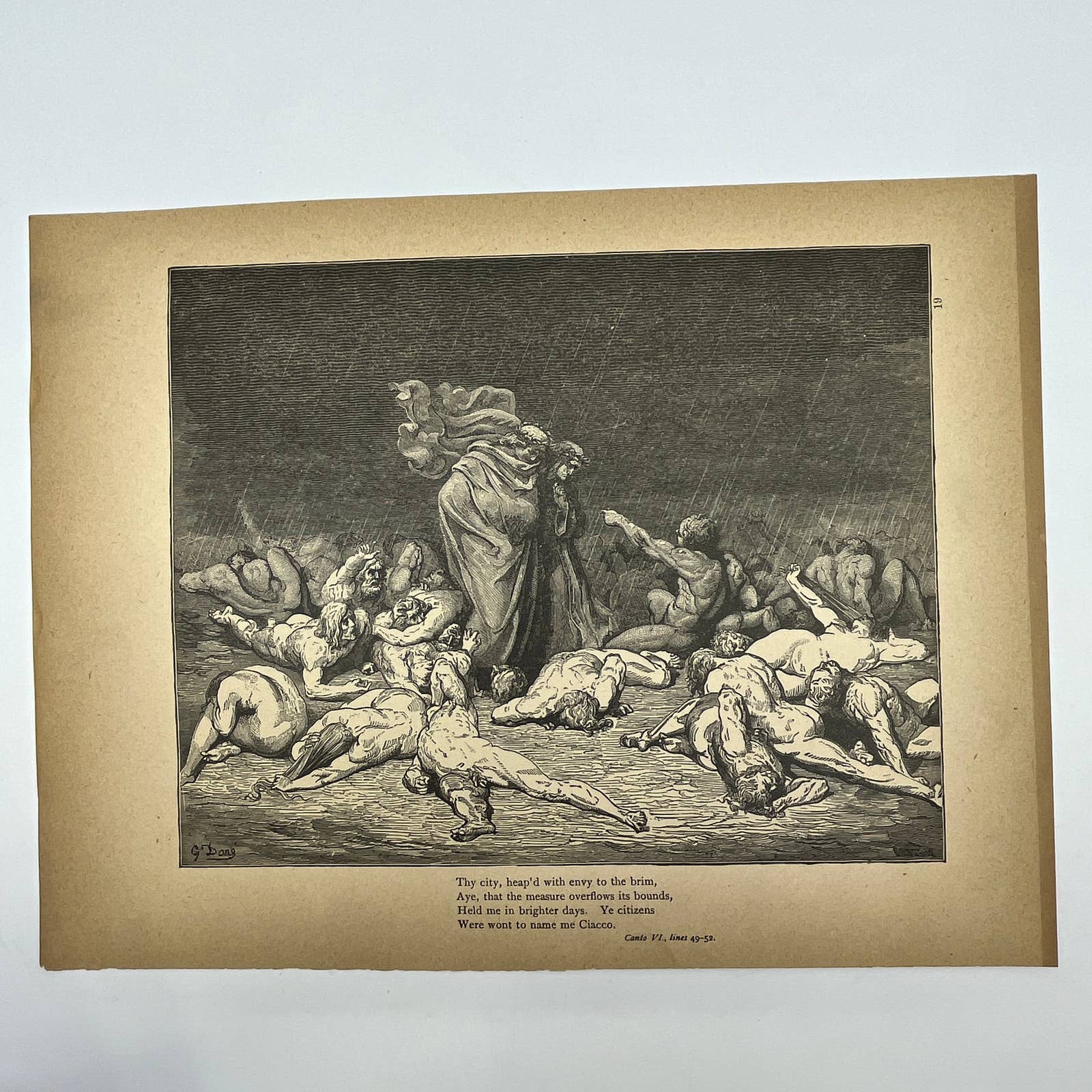 1880s Gustave Dore Engraving Divine Comedy Glutton Battered By Eternal Rain FL4