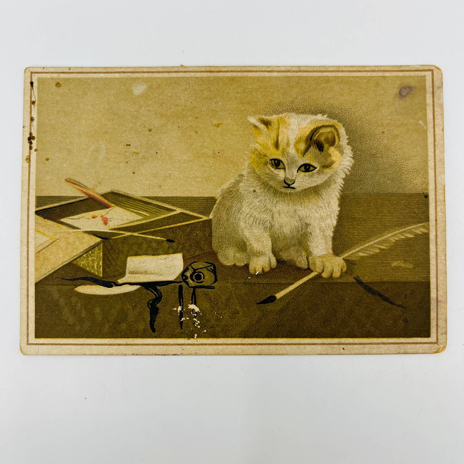 1880s Victorian Trade Card Lion Coffee Woolson Toledo OH Cat & Feather Dip Ink Pen AA2