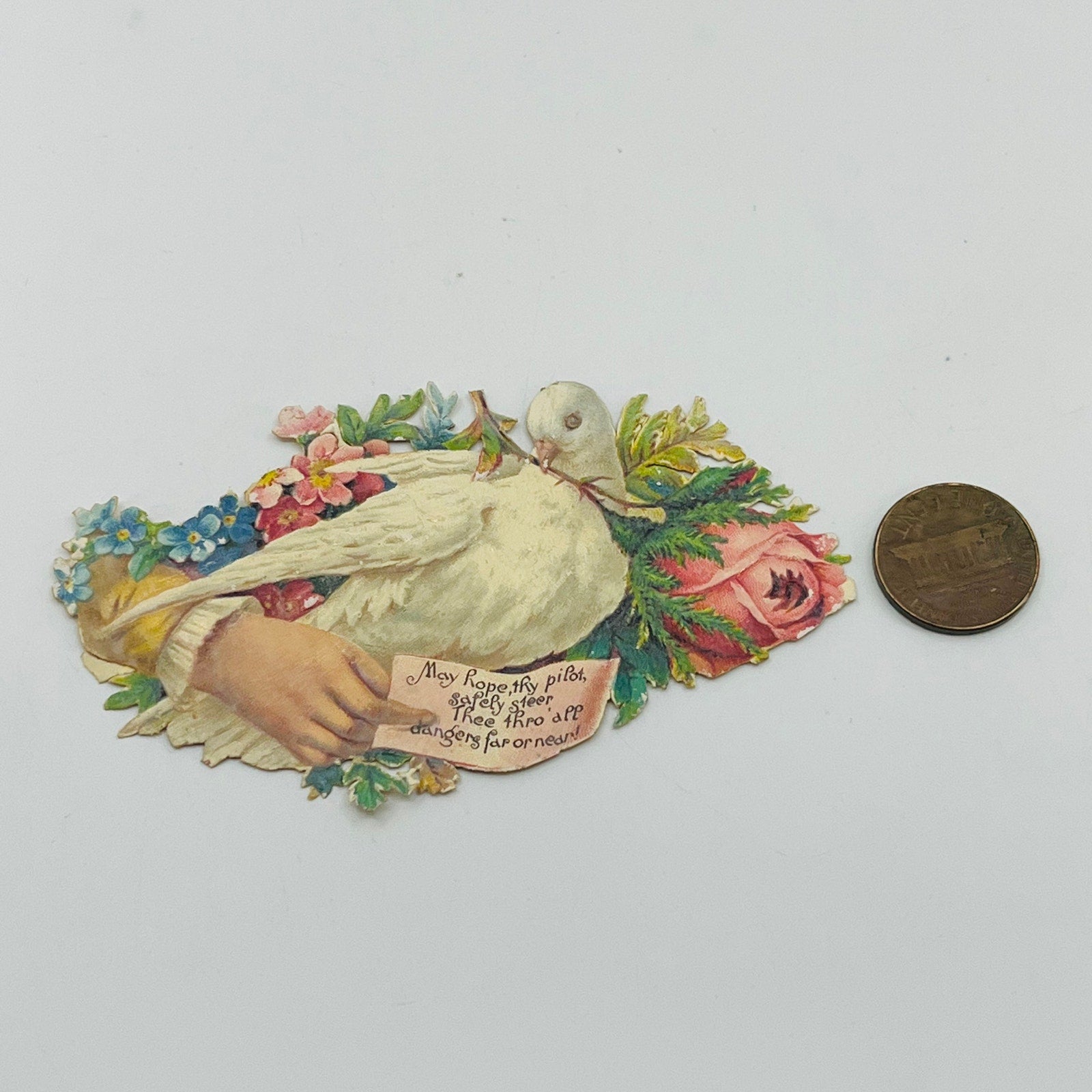 1880s Victorian Die Cut Calling Card Embossed Dove Hand Floral Poem SAH9-S9