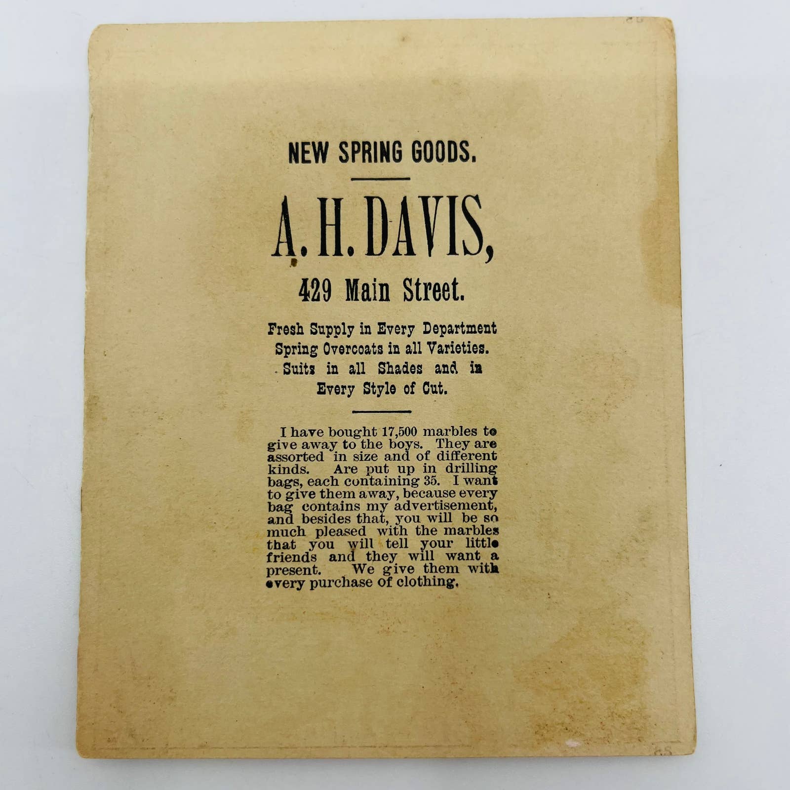 1880s Victorian Trade Card A.H. Davis Clothing Young Girl w/ Kitty Cat AA2