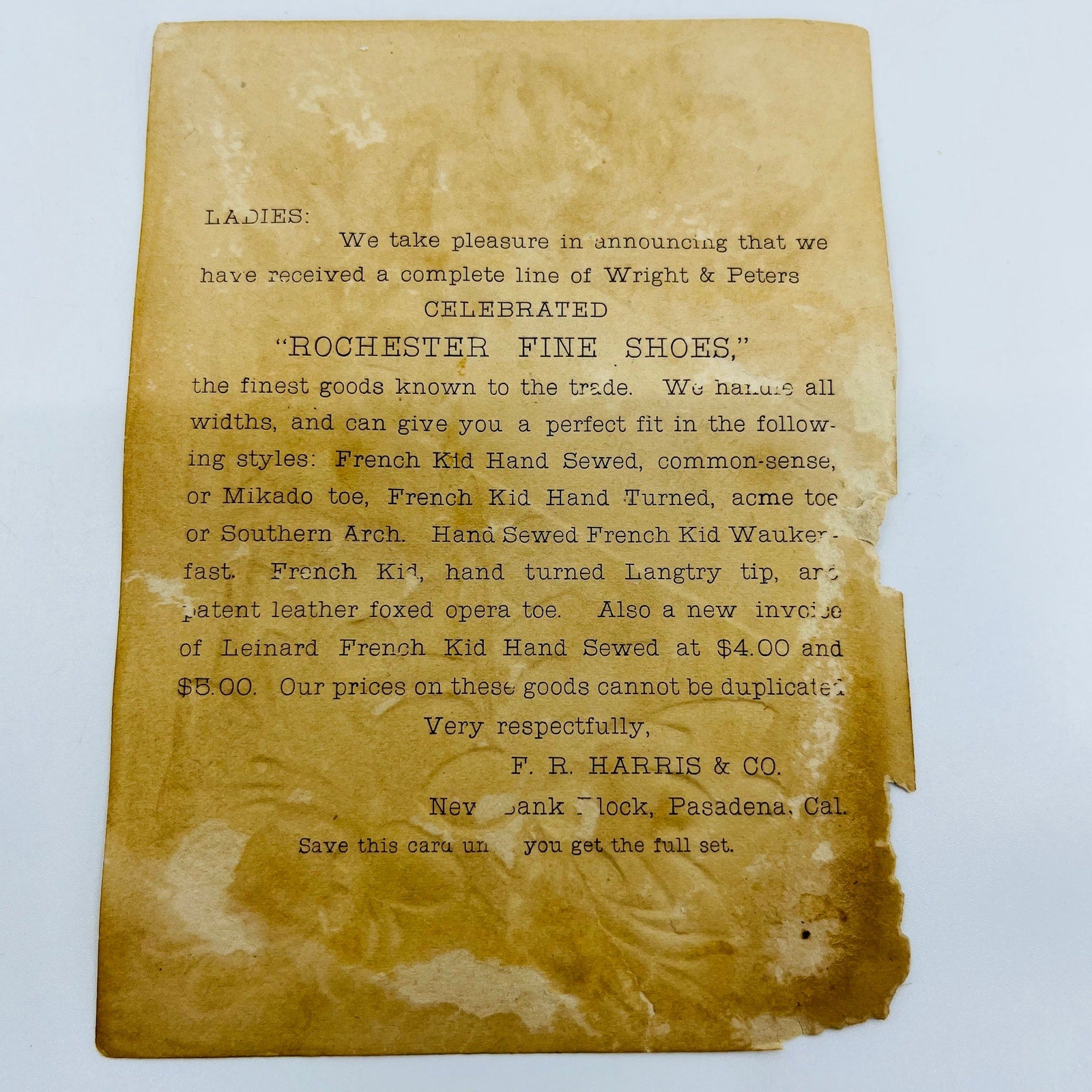1880s Victorian Trade Card F.R Harris Boots & Shoes Pasadena CA Embossed SAH9-H7