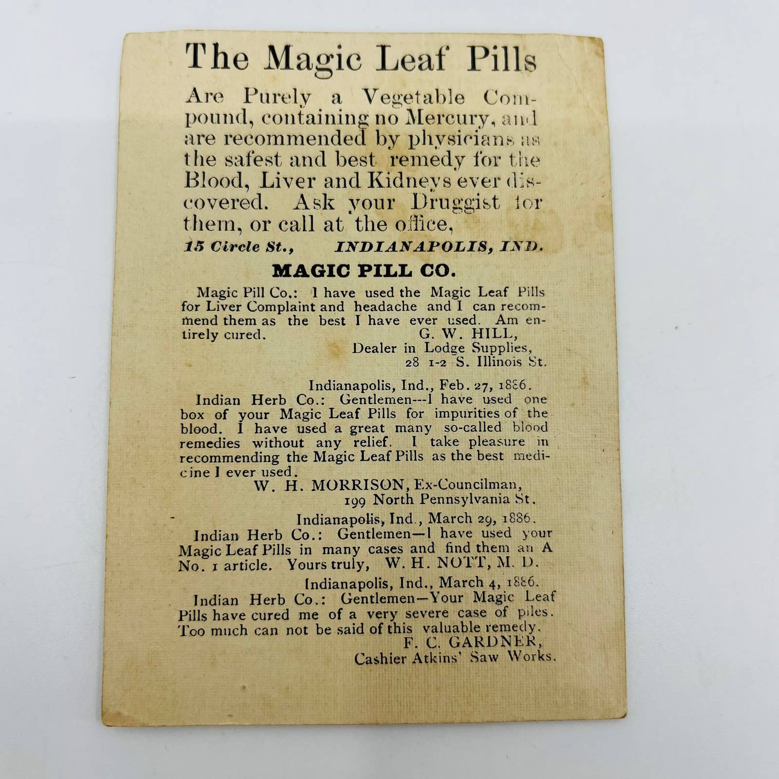 1880s Victorian Trade Card Indianapolis Quack Medicine Magic Leaf Pills AA2