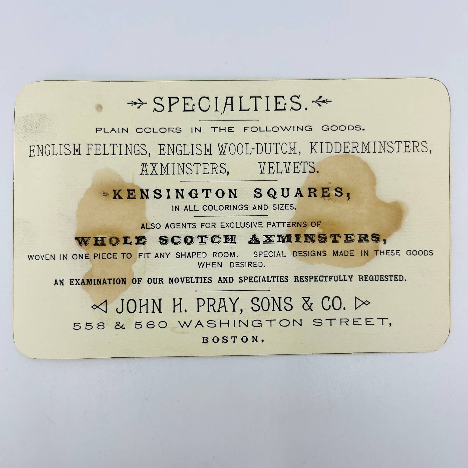 1880s Victorian Trade Card John Pray Sons & Co Washington St. Boston Mass AA2